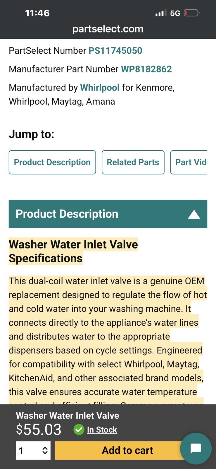 8182862 WHIRLPOOL GENUINE OEM WATER INLET VALVE 29 49 New