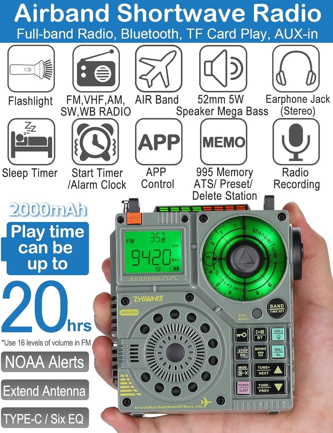 Shortwave Radio with Bluetooth and APP Control, AIR AM FM VHF SW WB Portable ...