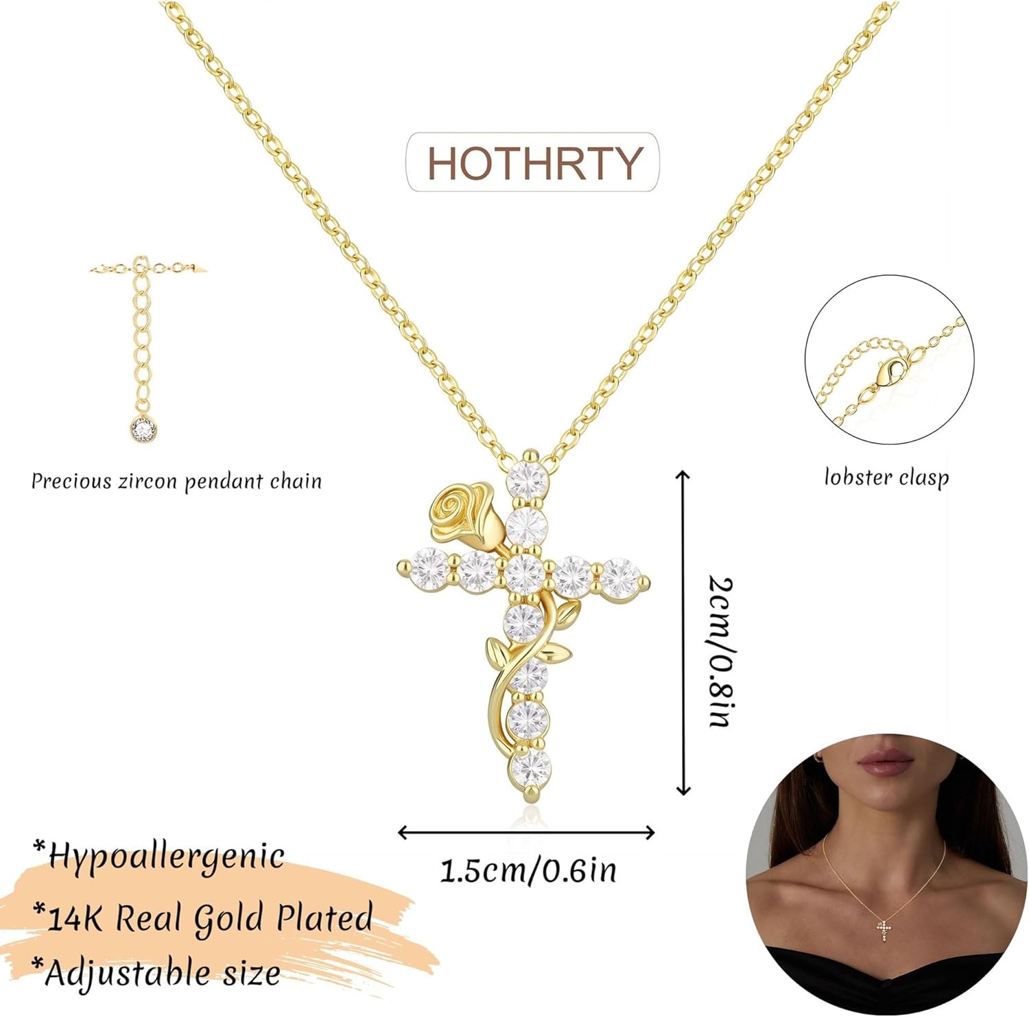 Gold Cross Necklace for Women Dainty Fashion 14K Gold Plated Zircon Rose Flower