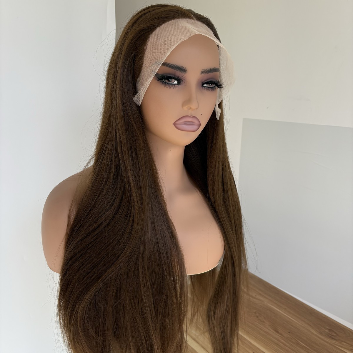 как выглядит Glue Less T Lace Front Wig Pre Plucked Long Straight Synthetic Hair Light brown фото