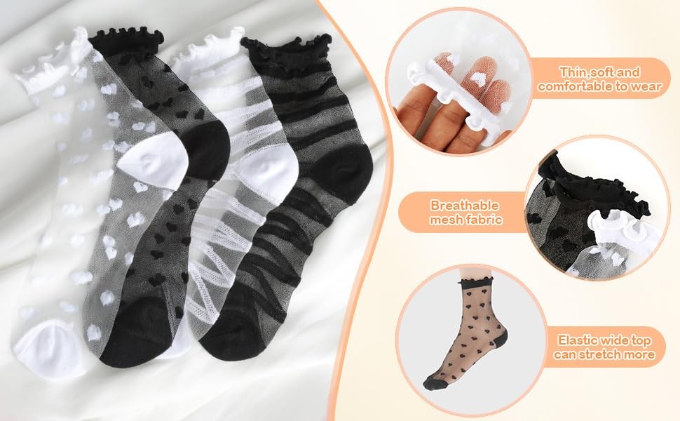 4 Pairs Sheer Socks Women Black Rufflenkle Socks for Women Thin Lace See A