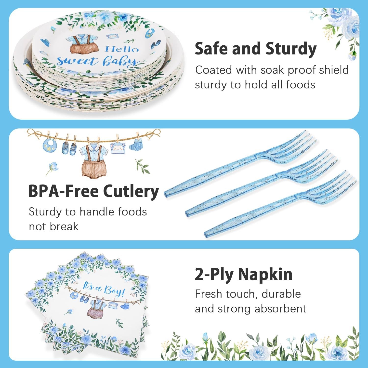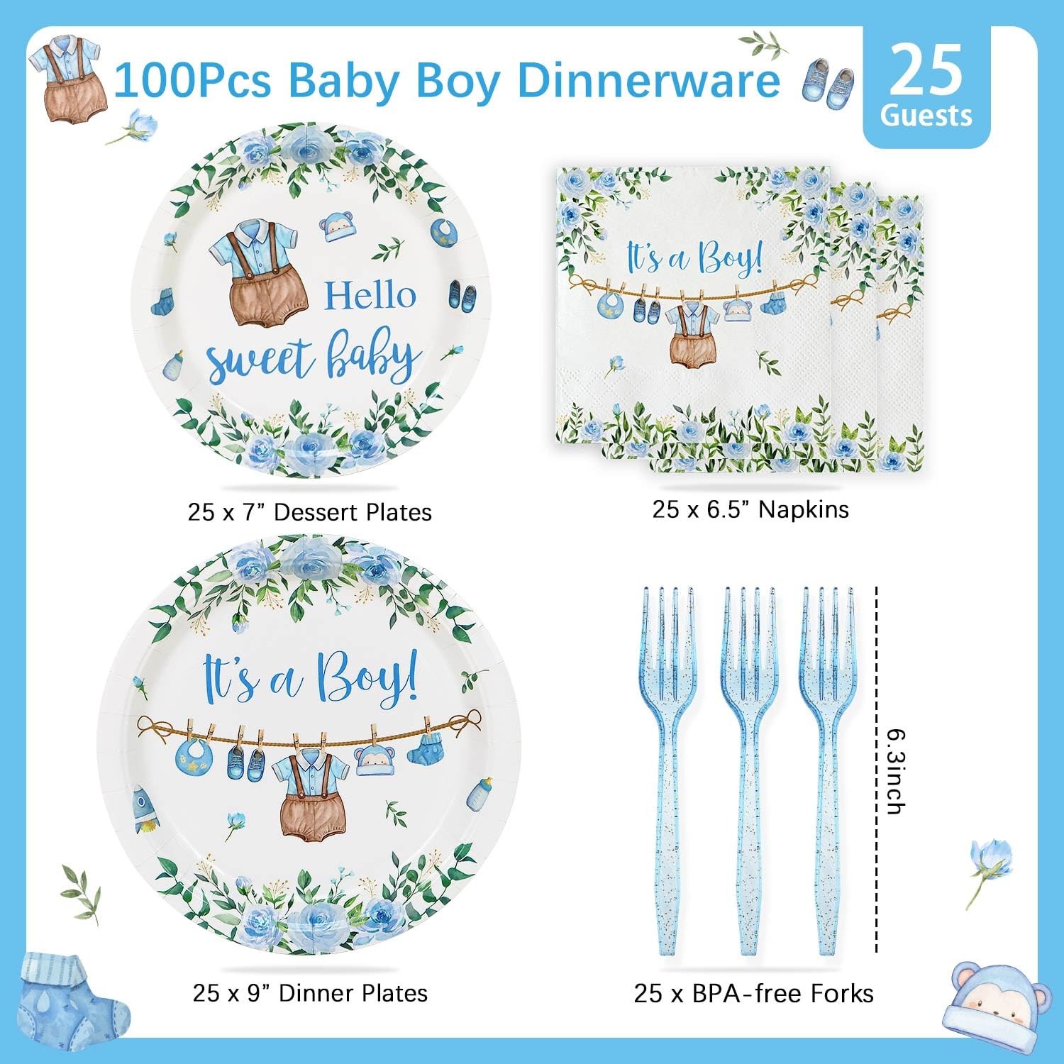 Boy Baby Shower Decorations Plates Set 25 Guests, 100 Pcs Blue It's a Boy Swe...