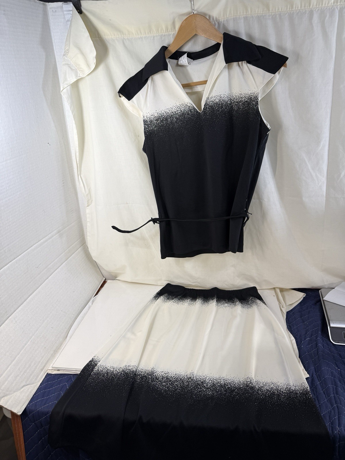 как выглядит Vtg 70s Black White Ombre Stipple Print Skirt Set Top Midi Skirt Retro 2pc фото