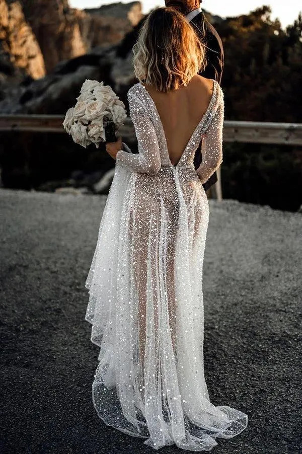 Sparkling Sequin Beach Bohemian Wedding Dress V-neck Long Sleeved Bridal Gown