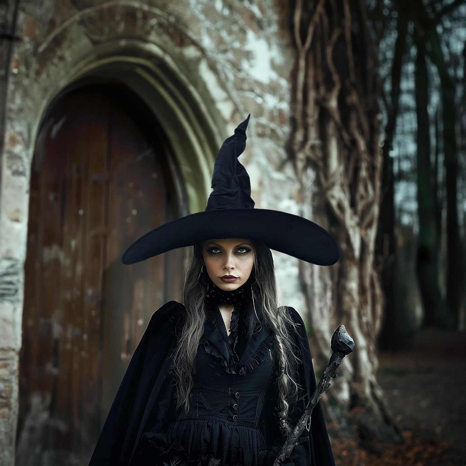 Women'S Black Masquerade Ruched Witch Hat Oversized Witches Hats Wide Brim Party