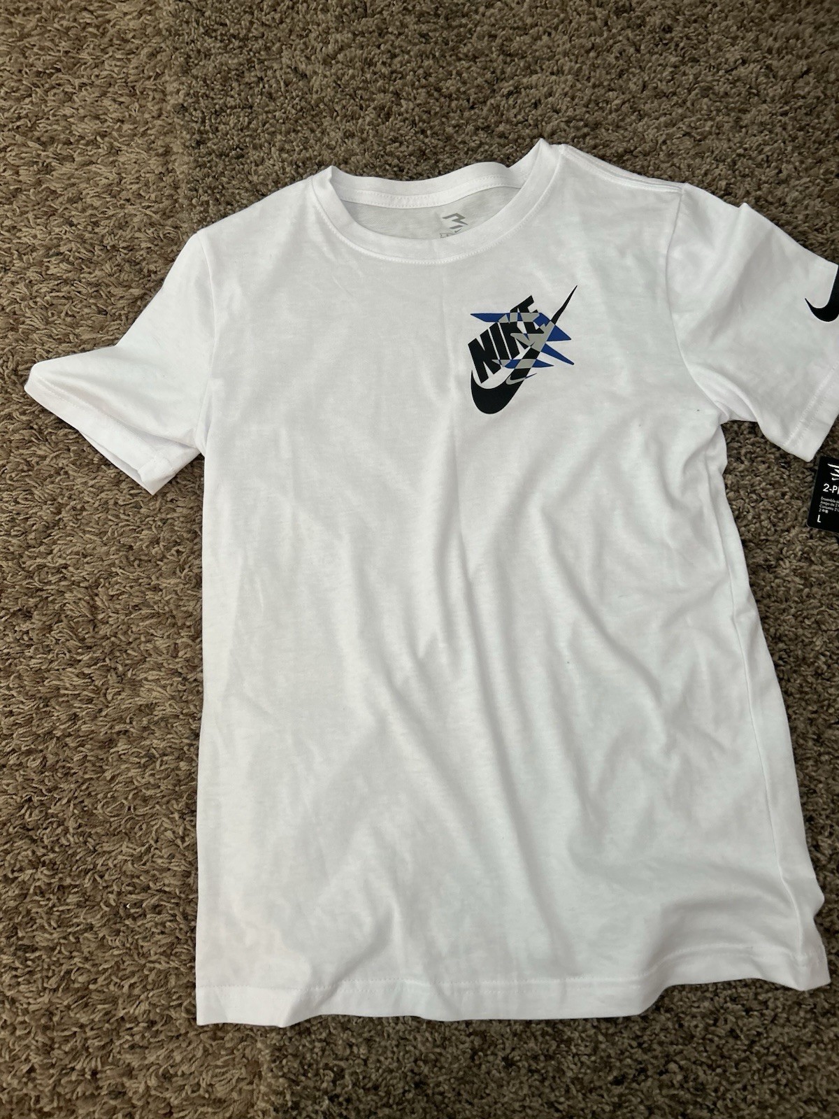 как выглядит Youth Nike Set With A White Nike Logo And A Grey Pair Of Shorts With The Logo фото