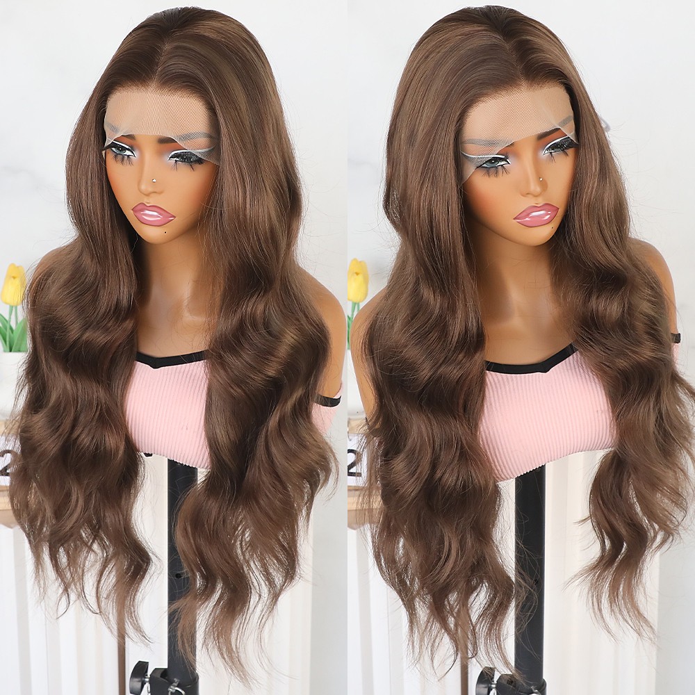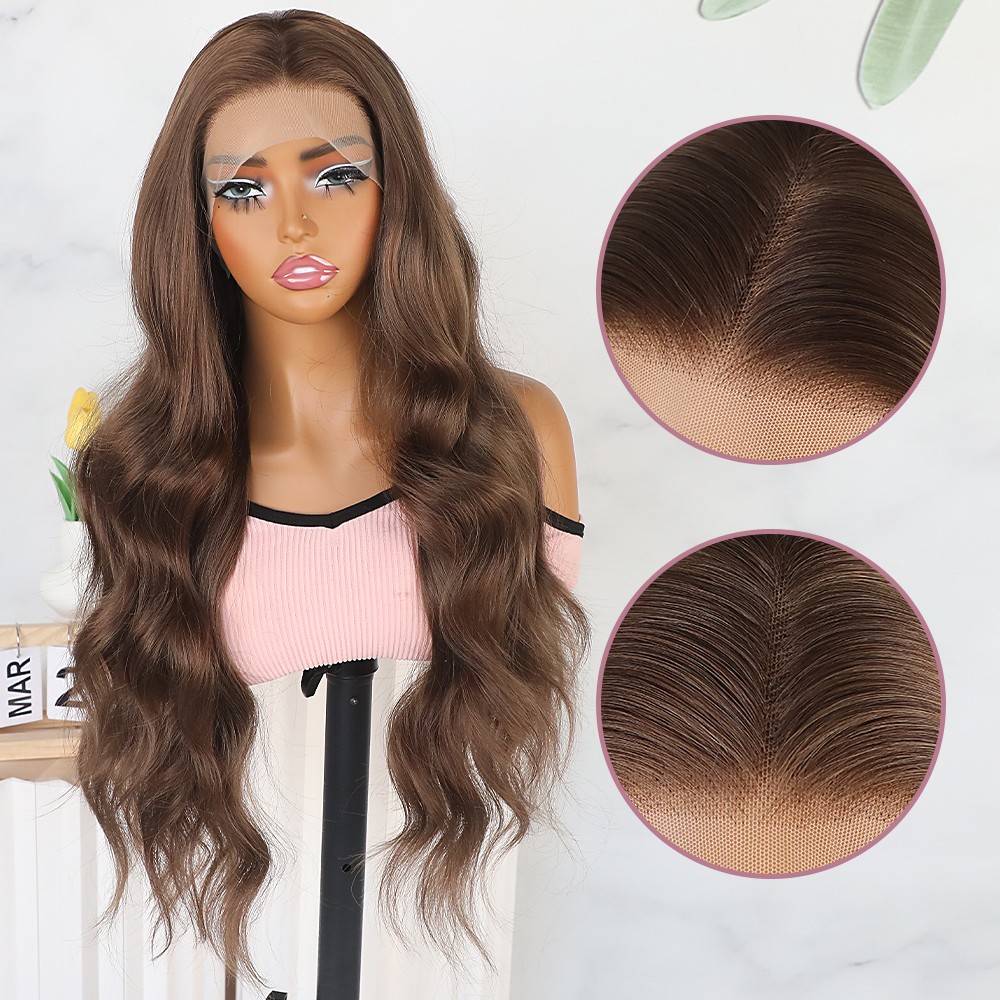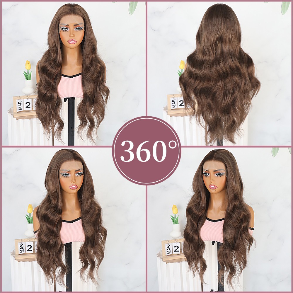 13x4 Heat Resistant Long Natural Wavy Brown Hair Glueless Frontal Lace Wigs Soft