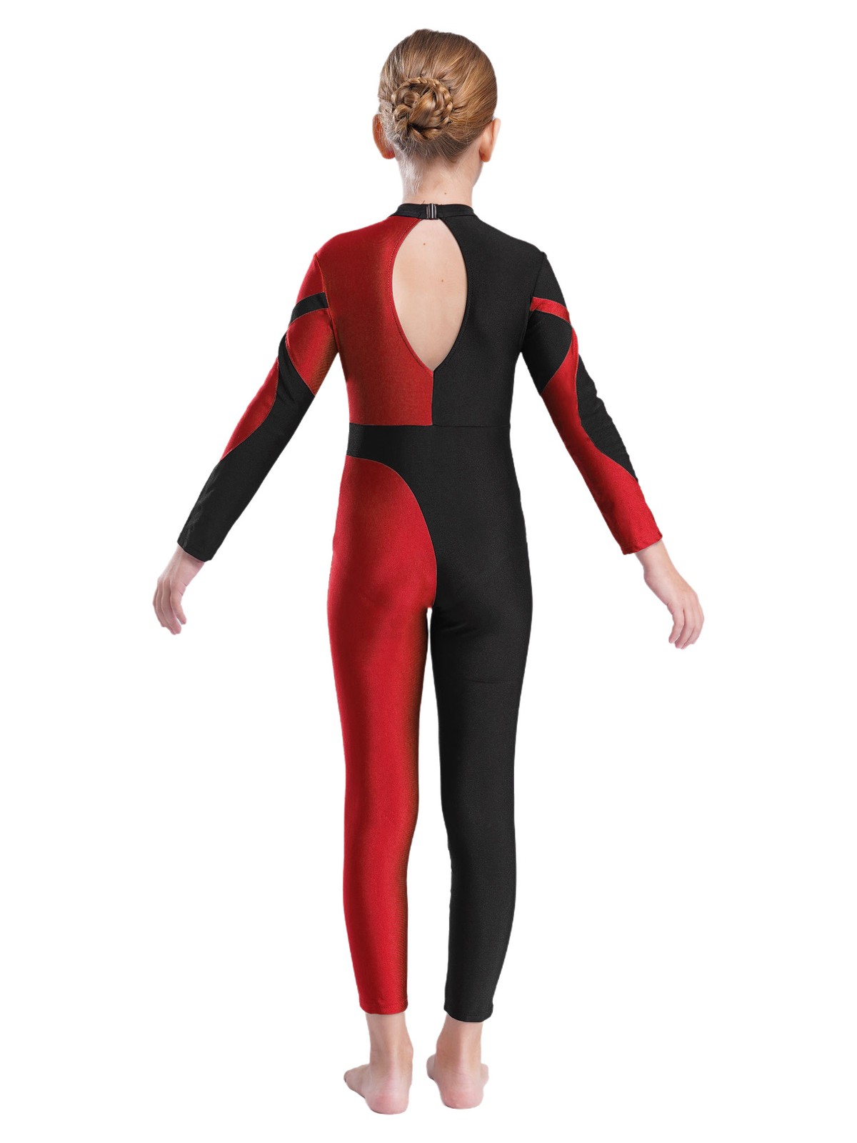 Girls Long Sleeves Rhinestone Contrast Color Hollow Back Dance Leotard Jumpsuit