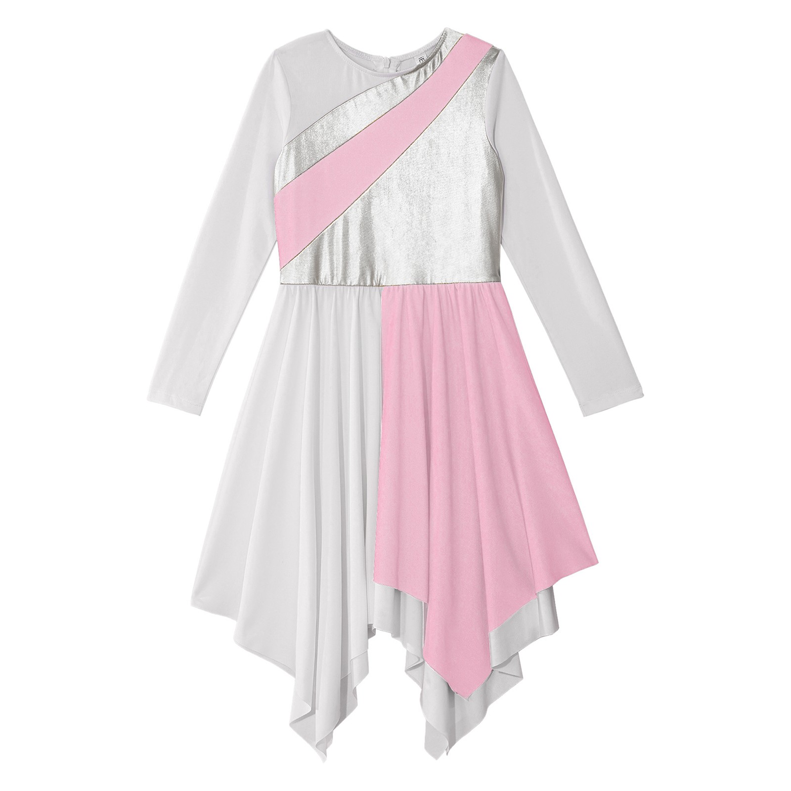 Girls Metallic Color Block Praise Dance Long Sleeve Liturgical Worship Dress