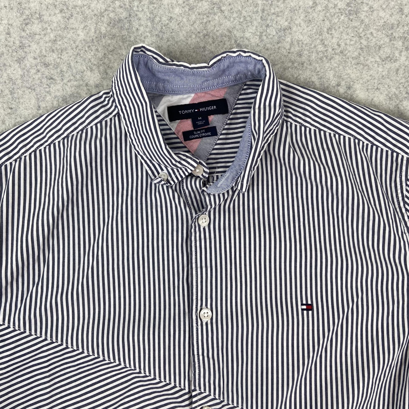 Tommy Hilfiger Shirt Mens Medium Blue Striped Slim Fit Short Sleeve Button Up