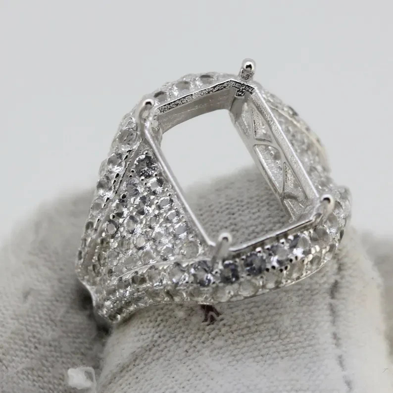 Sterling Silver Semi Mount Ring Setting Emerald OCT 14x10mm Halo White Topaz Acc