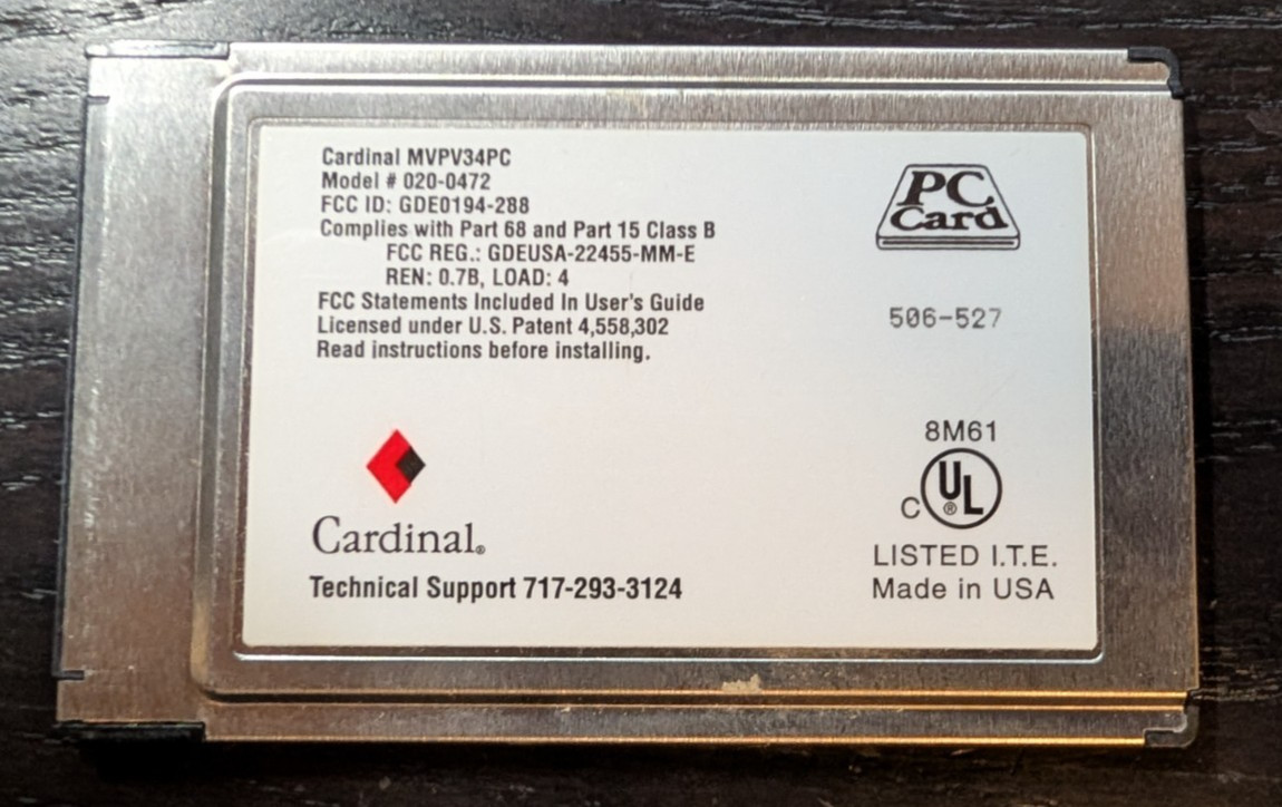 Cardinal 33.6 V.34 Fax Modem PCMCIA Card