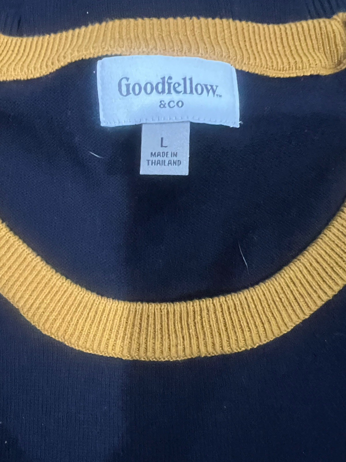 как выглядит Goodfellow Co Knit Striped Navy Yellow Pullover Sweater Mens Long Sleeve L фото