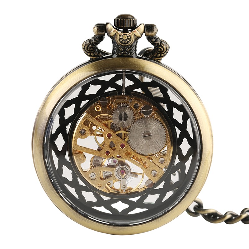 Bronze See-Through Mechanical Pocket Watch Hand-Wind Skeleton Roman Dial Chain