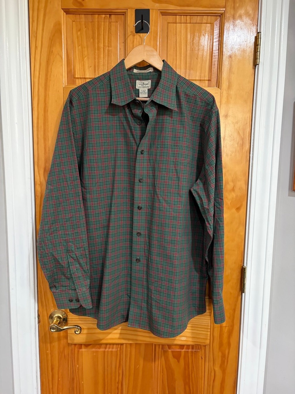 LL Bean Plaid Button Down Shirt Green Red Tartan Cotton Wrinkle Resistant Large