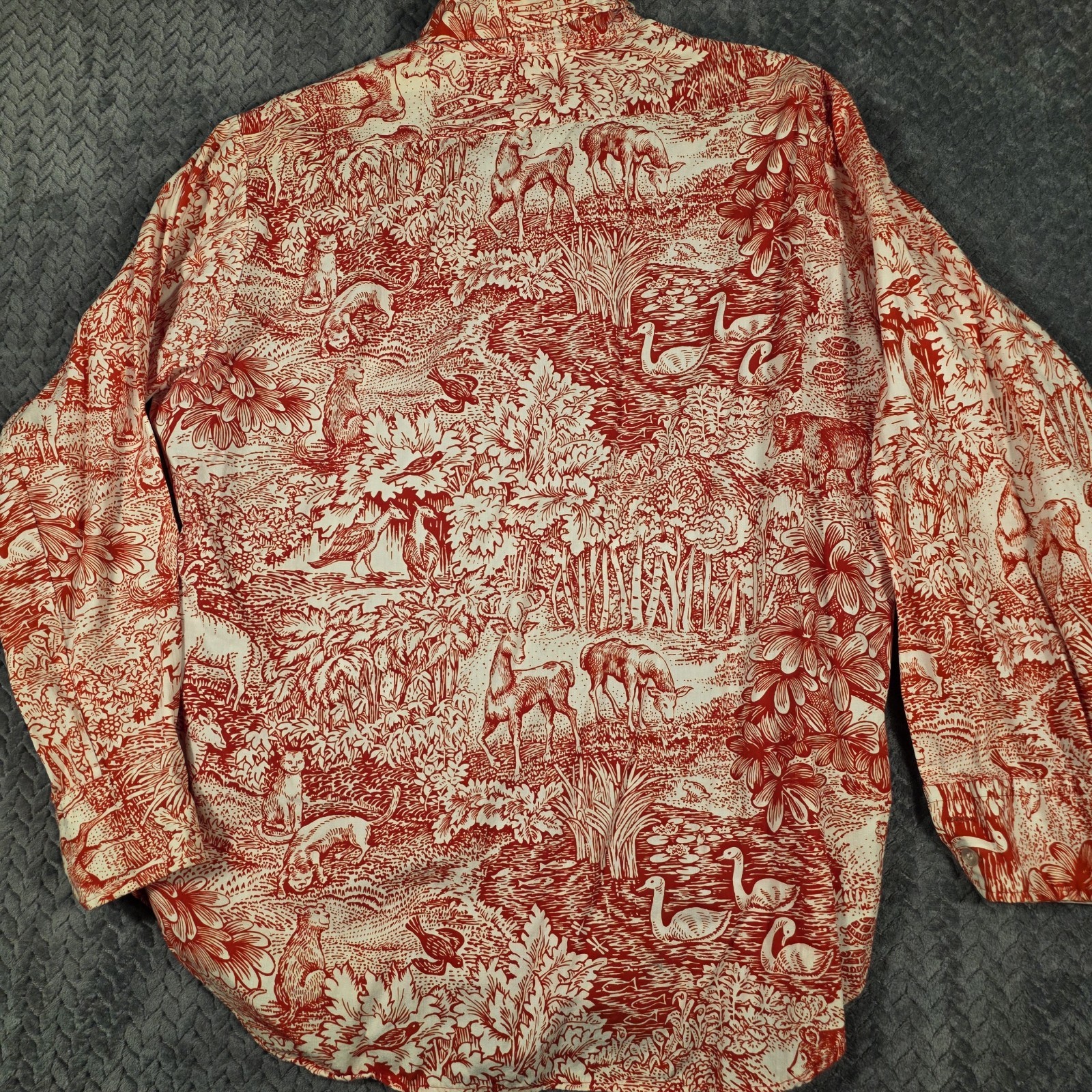 как выглядит Vintage Men s Button Up Shirt Large Red Toile Novelty Scenic Print Long Sleeve фото