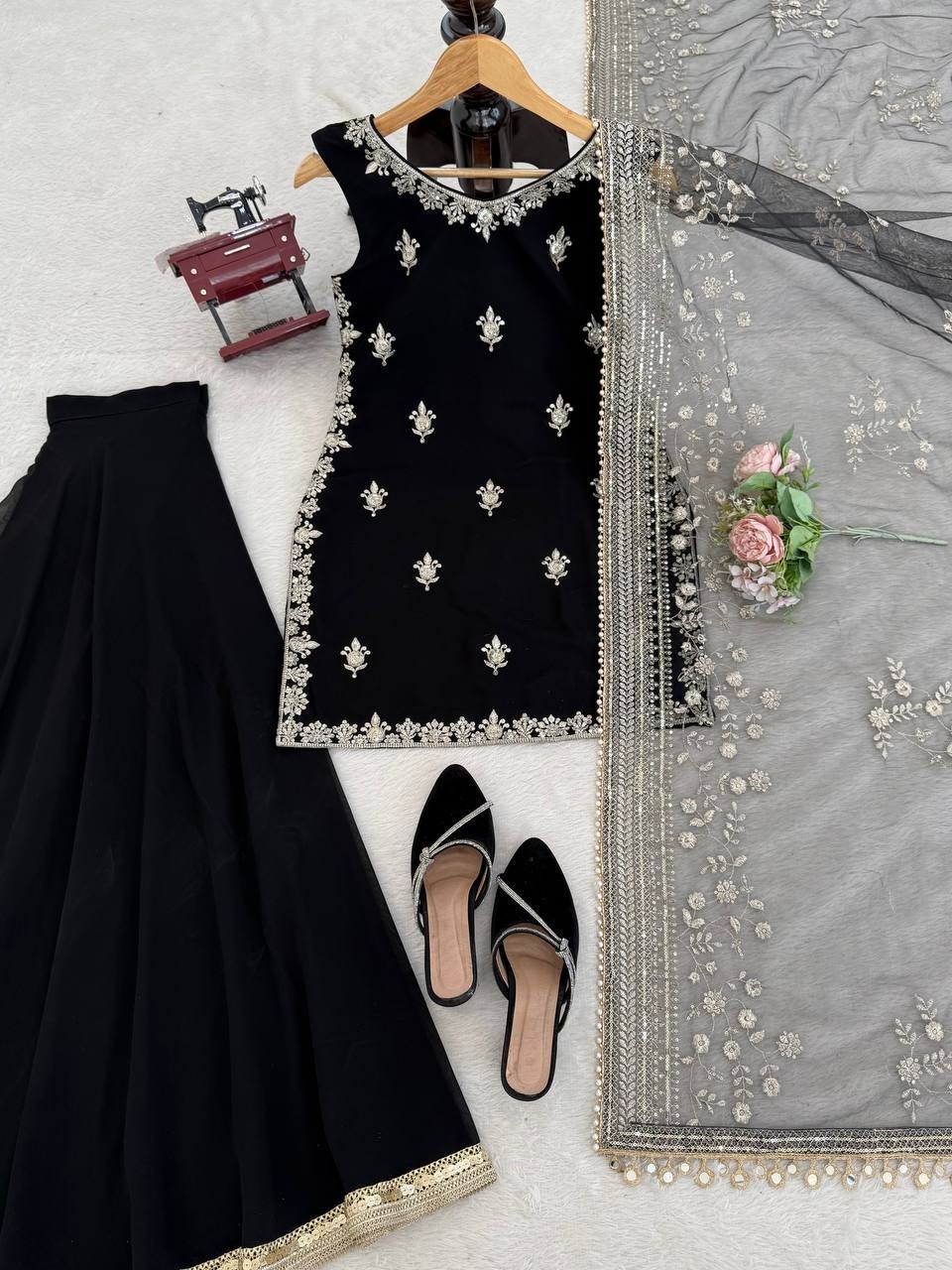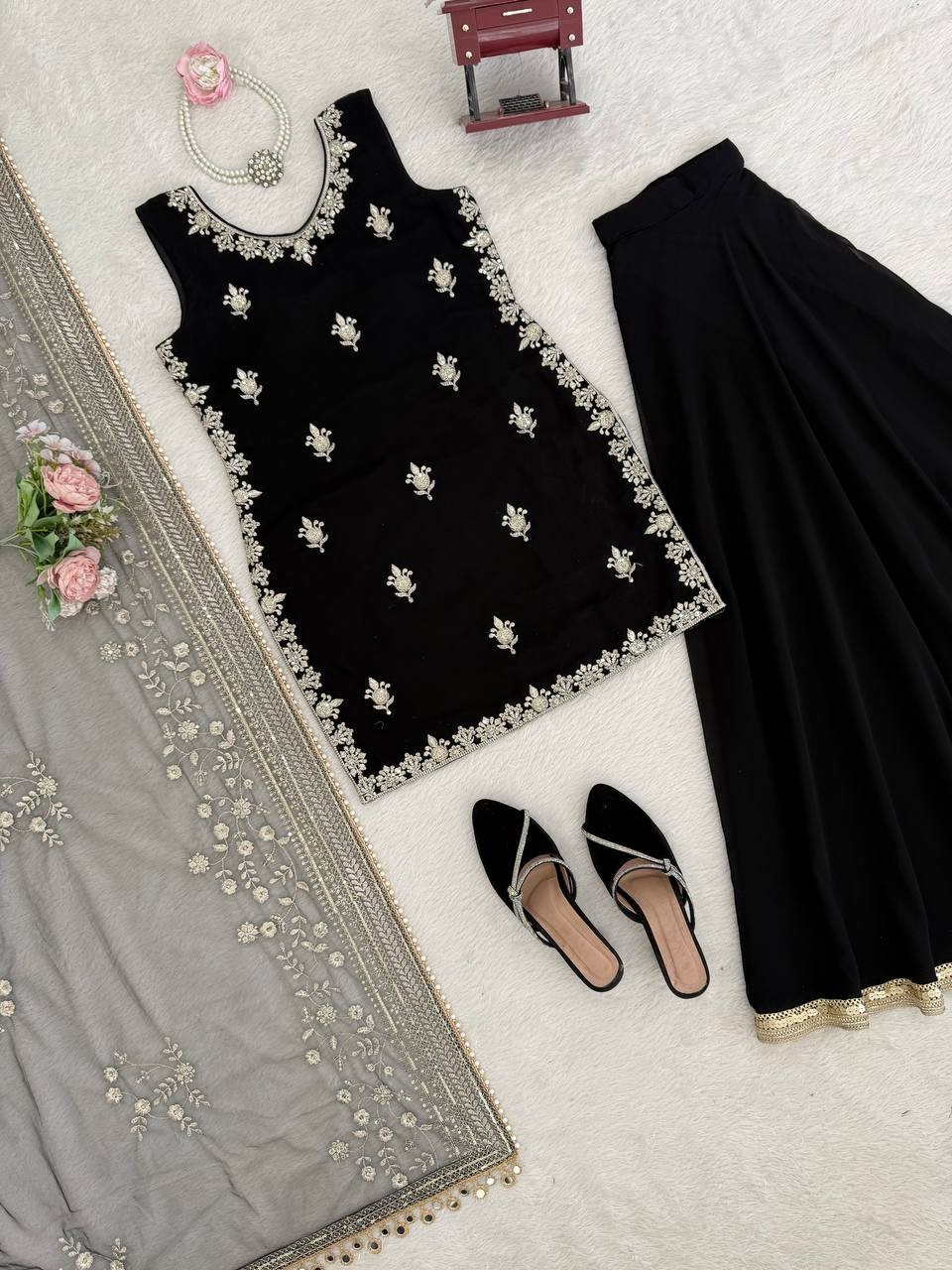 как выглядит Designer Black Faux Georgette Palazzo Suit With Dupatta For Reception Wear фото