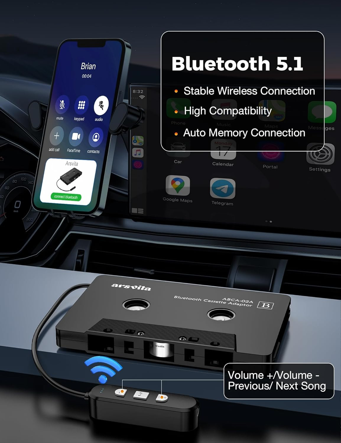 Arsvita 5.1 Bluetooth Cassette Adapter, Car Audio Bluetooth Cassette Receiver