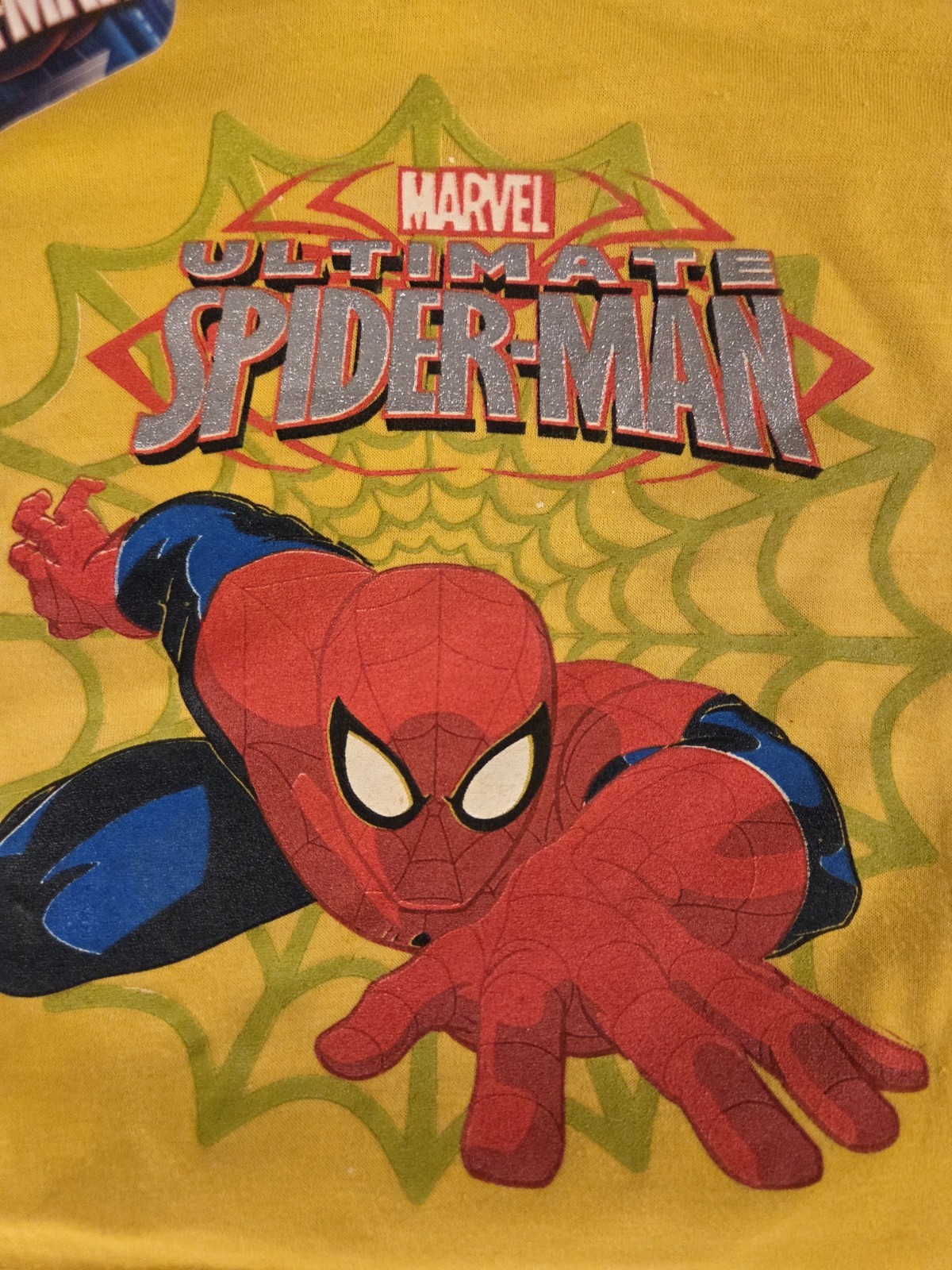 как выглядит Marvel Ultimate Spider-Man Boys 12M 2PC Set NWT Yellow Tee Blue Shorts Outfit фото