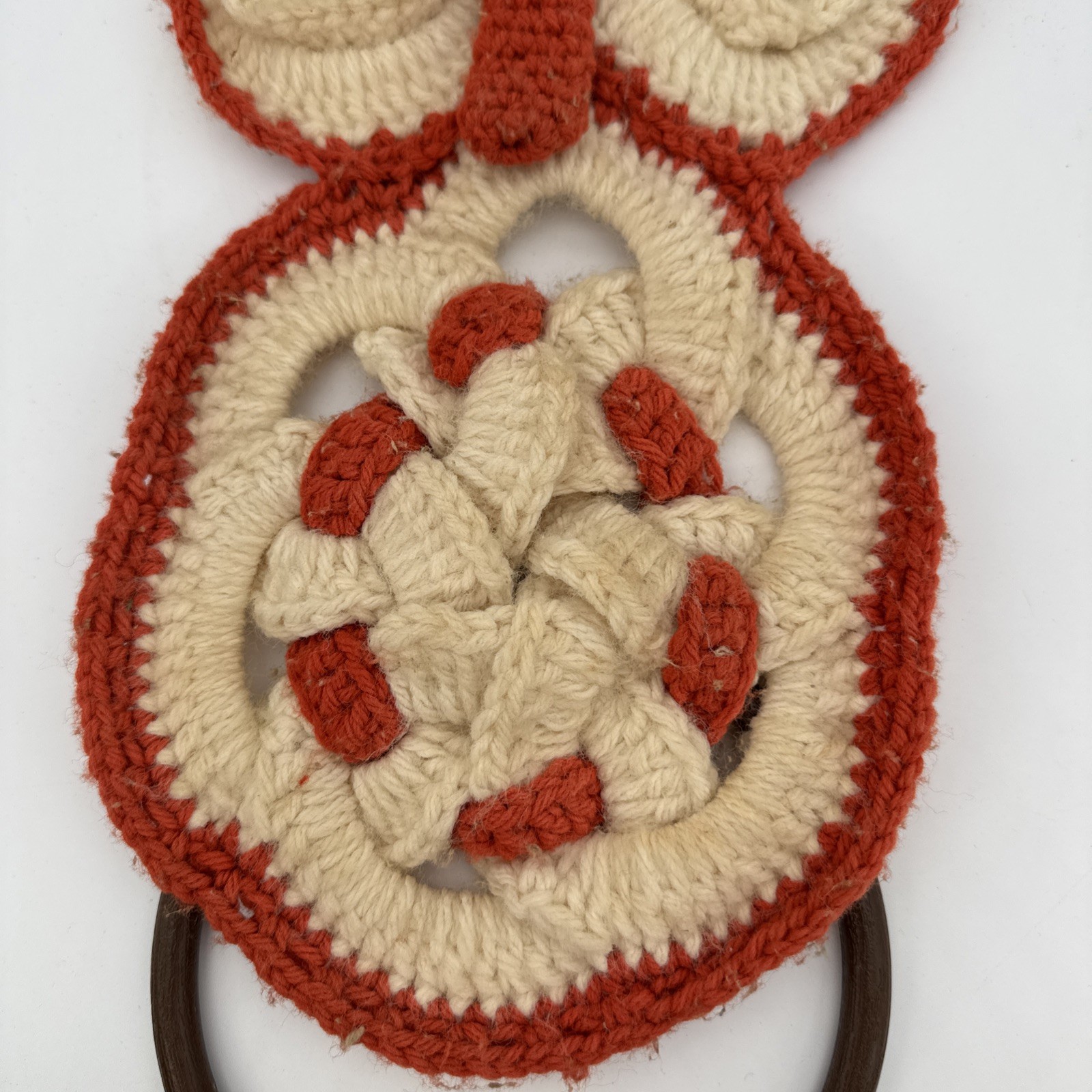 • Vintage Macrame Owl Wall Hanging/Towel Holder Boho Burnt Orange Cream 70s Eyes