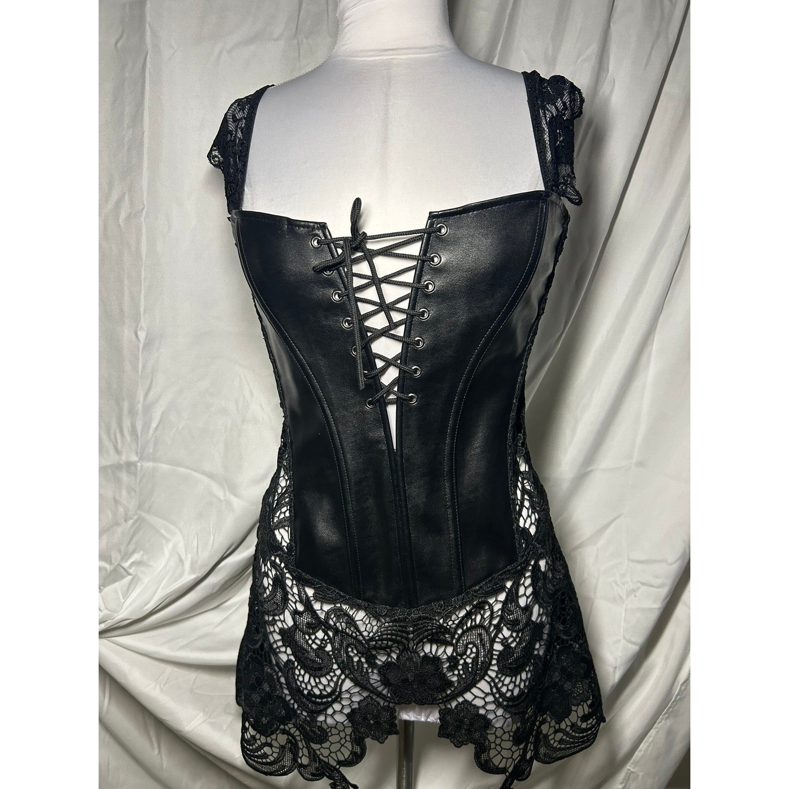 Black Faux Leather Lace Up Corset Top Floral Lace Panels Goth Grunge Punk Small