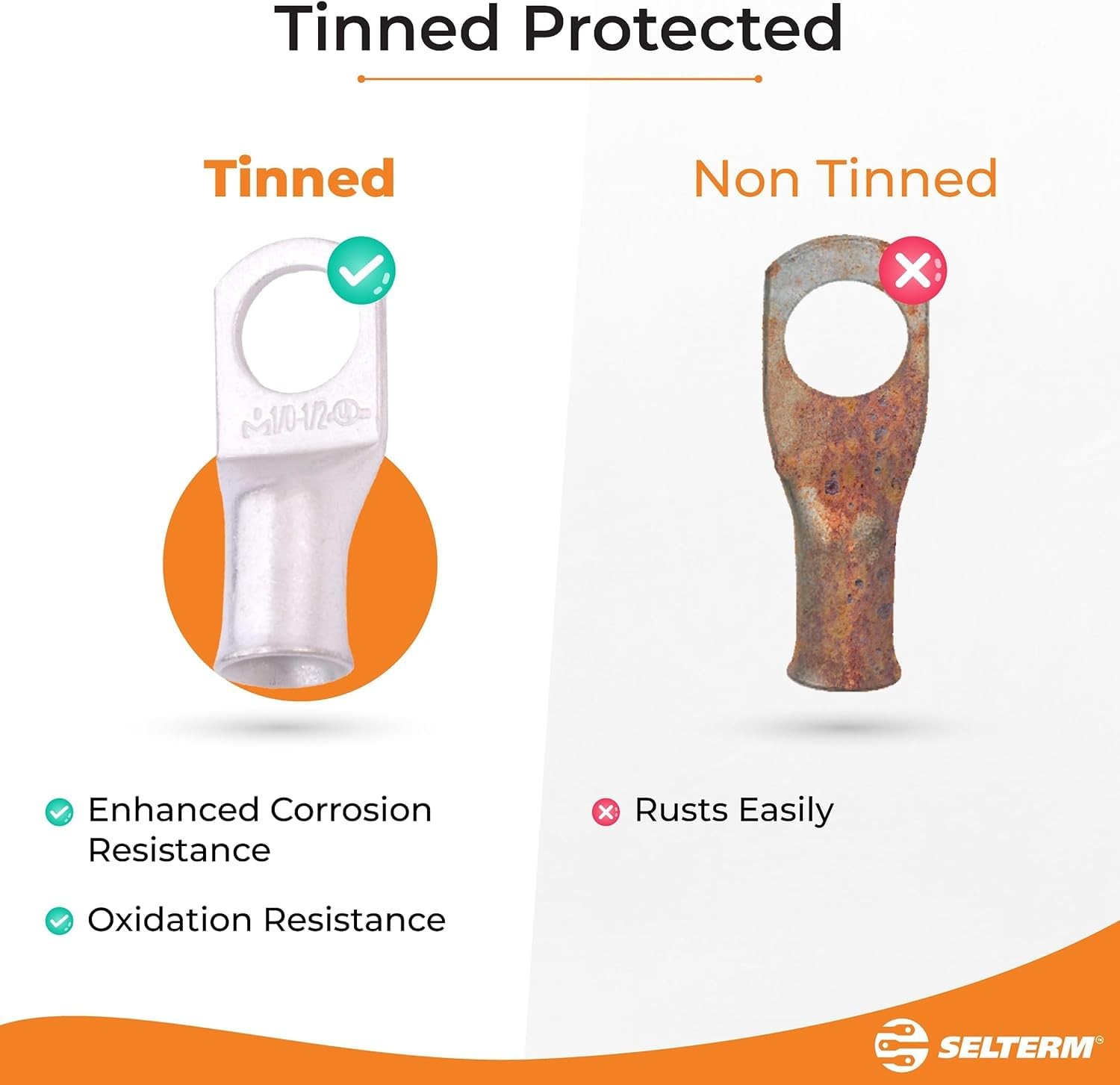 SELTERM 10pcs 1/0 AWG1/2 Stud Tinned Copper Wire Lugs, Heavy Duty Battery Ca...