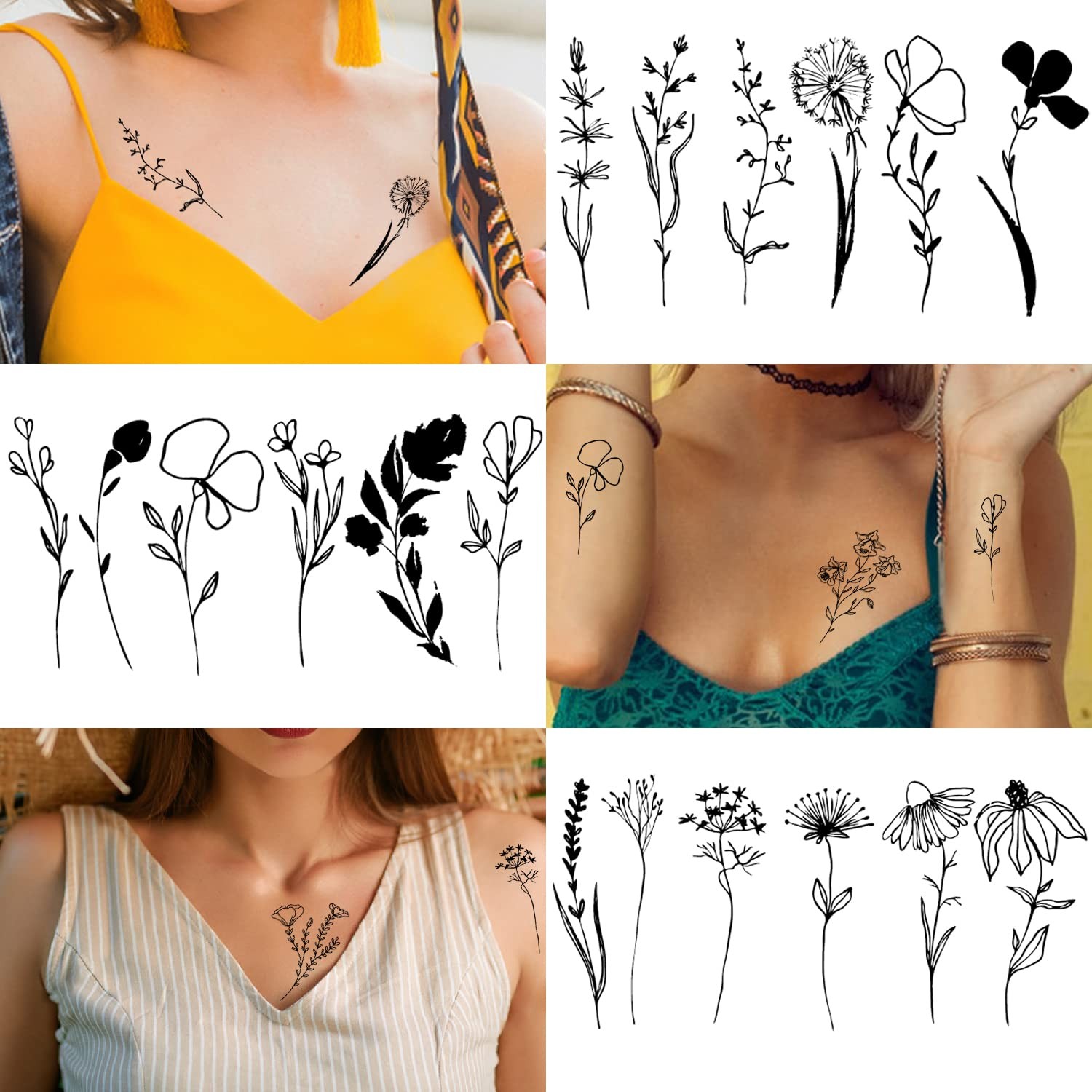 Cerlaza 75 Styles Tiny Black Flower Branch Temporary Tattoos For Tiny,