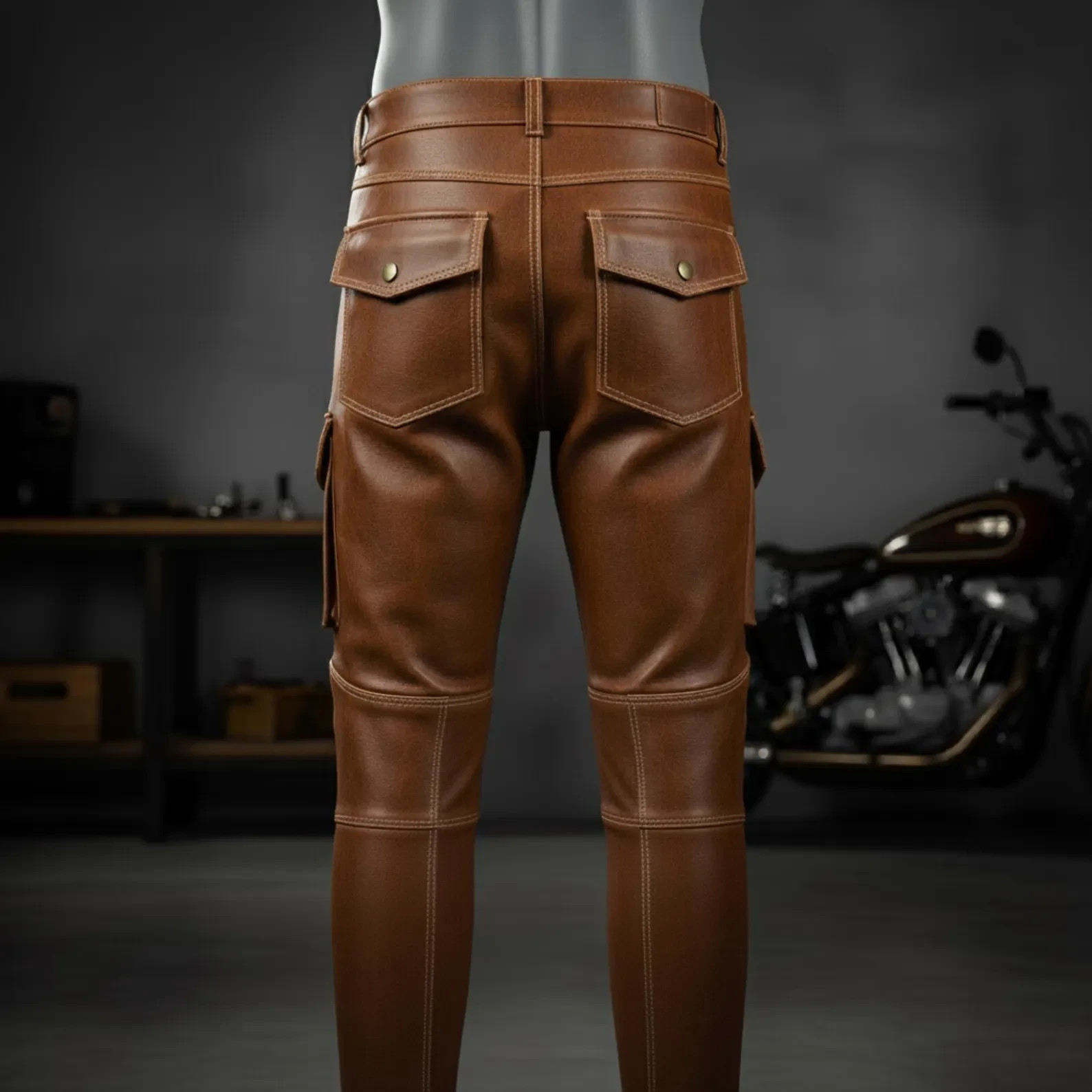 Handmade Brown Cowhide Leather Motorcycle Pants Biker Cargo Trousers