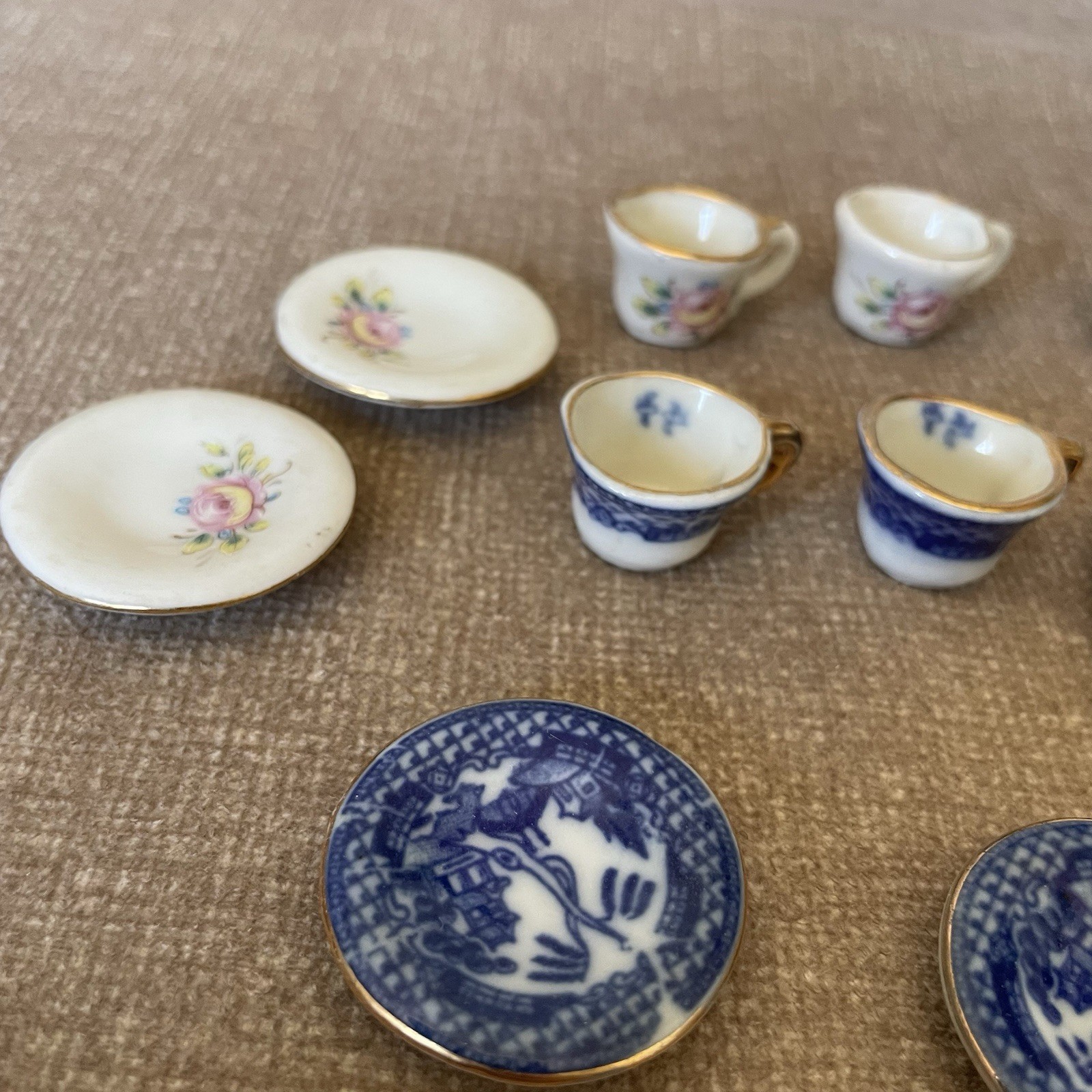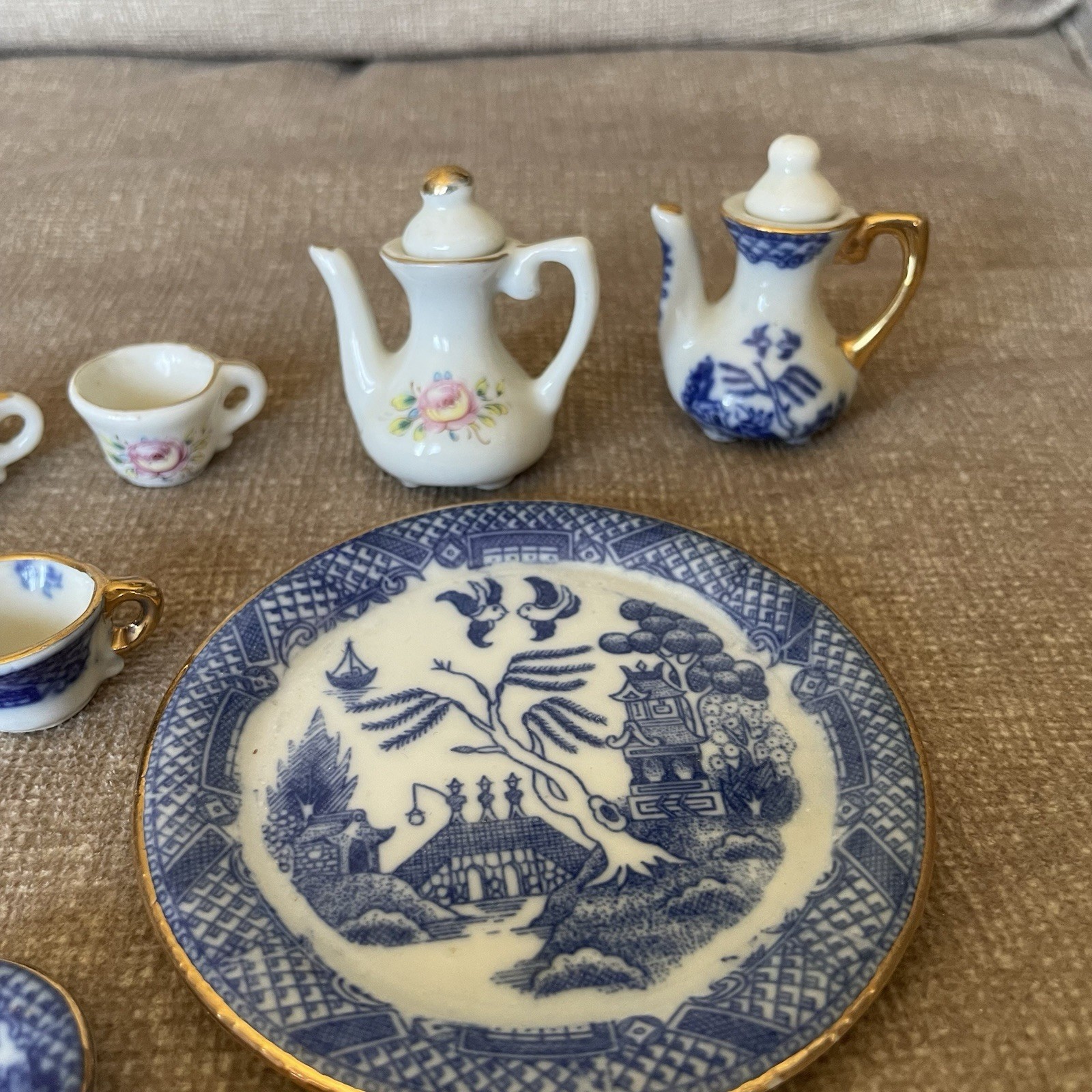 Antique Miniature Ceramic Tea Set 11 Pcs Blue Willow Blue White w/Gold Trim