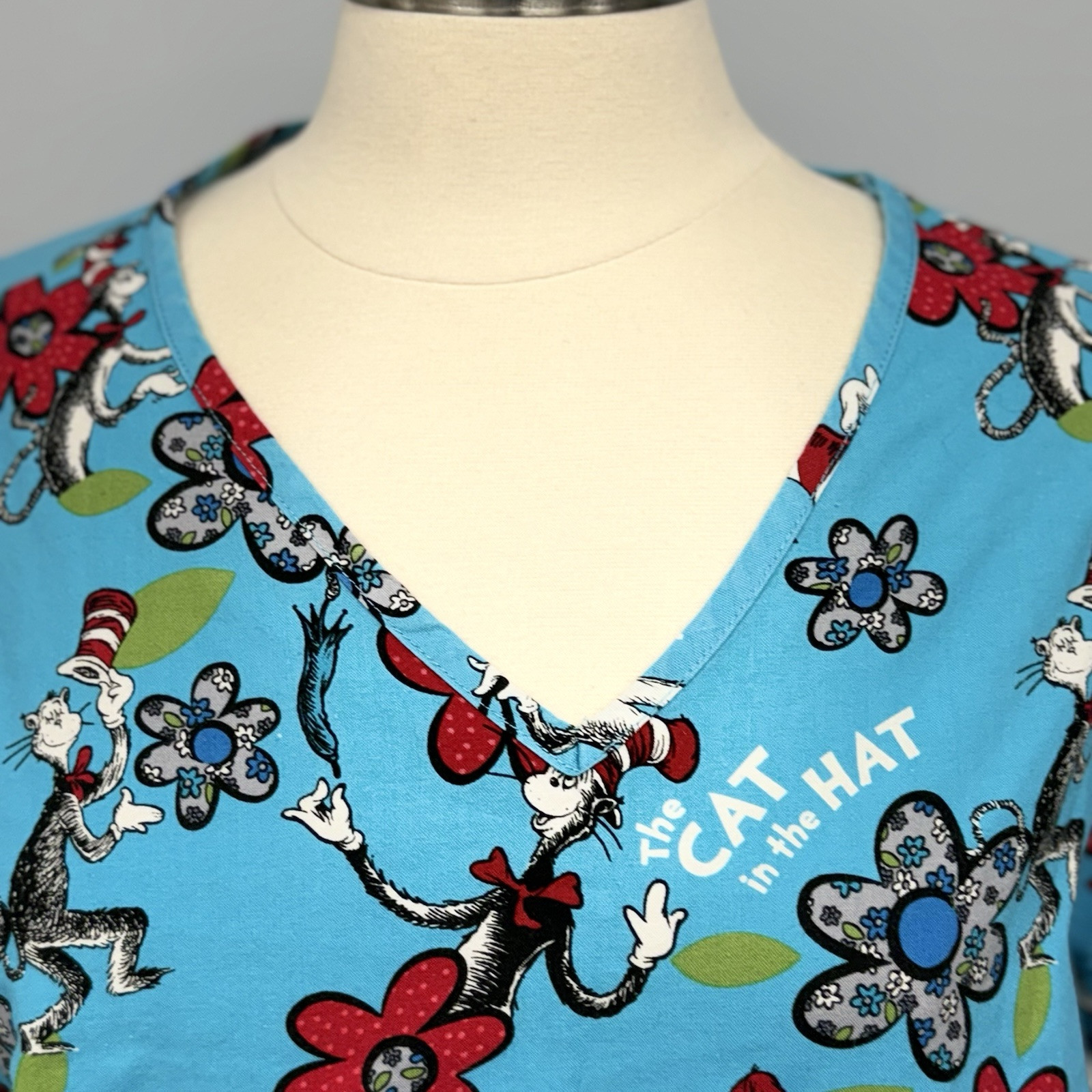 Dr Seuss Cat In The Hat Scrub Top L Blue Scrubs Nurse Medical Uniform Cotton