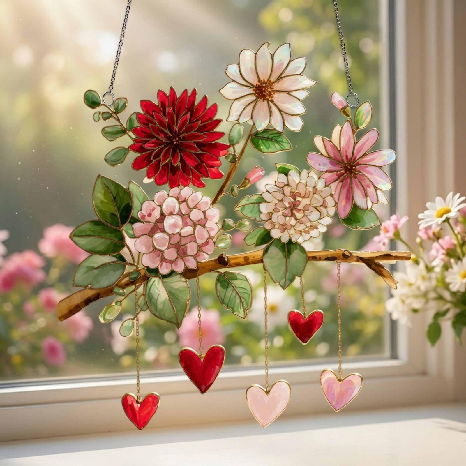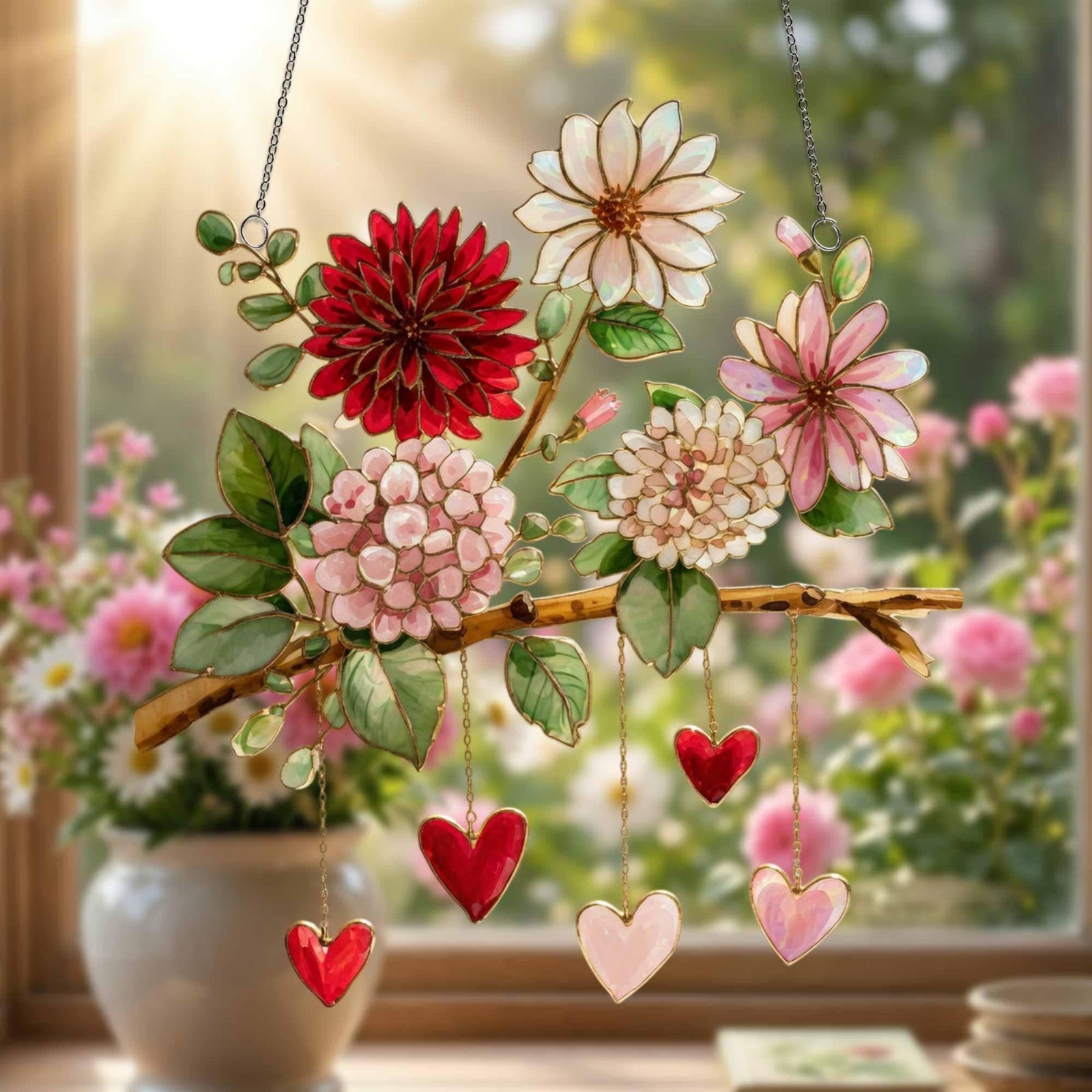 Mixed Floral Branch Acrylic Suncatcher, Heart Dangles Window Decor Gift