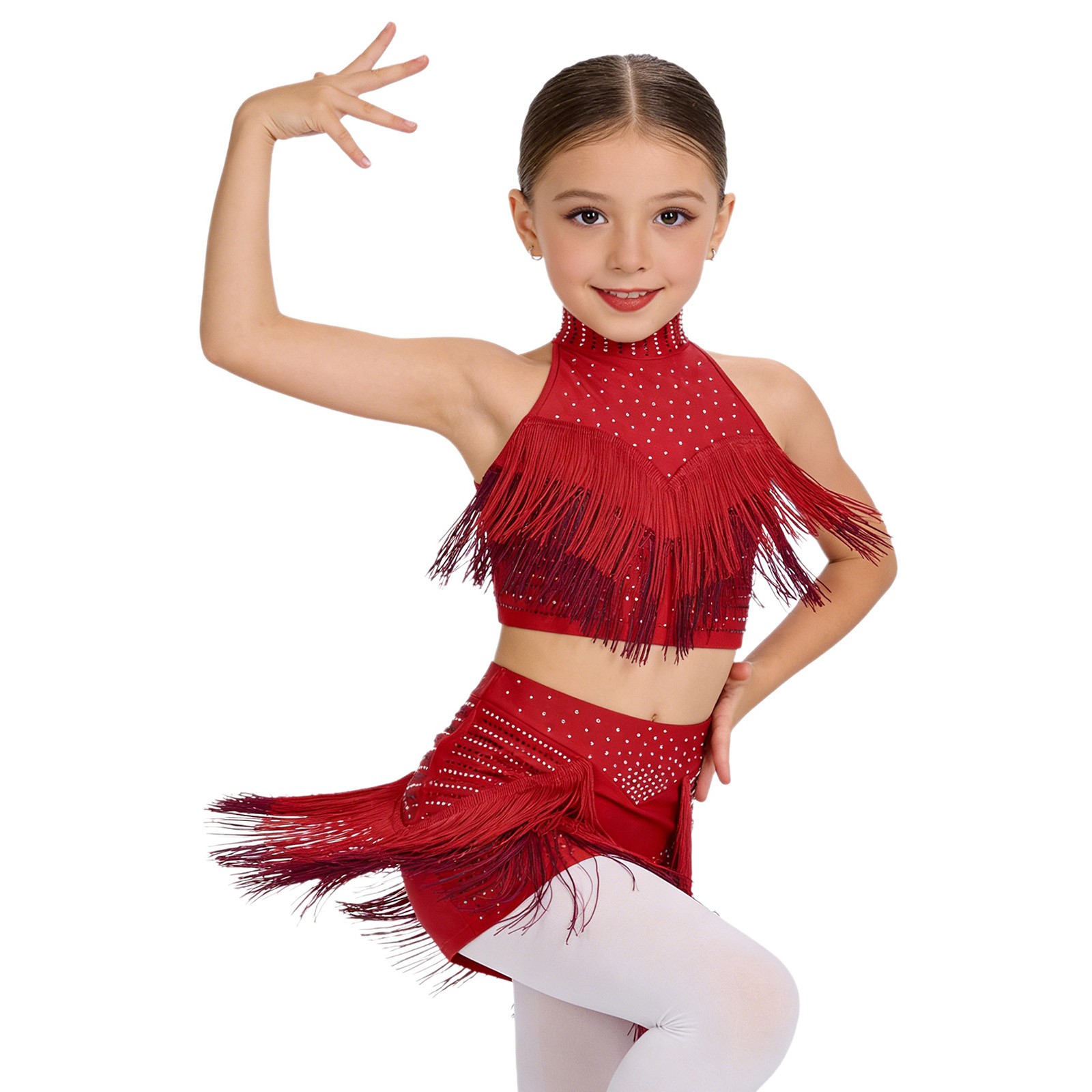 Girls Outfit Sparkly Dancewear Backless Sets Halter Ballroom Rumba Costume Jazz