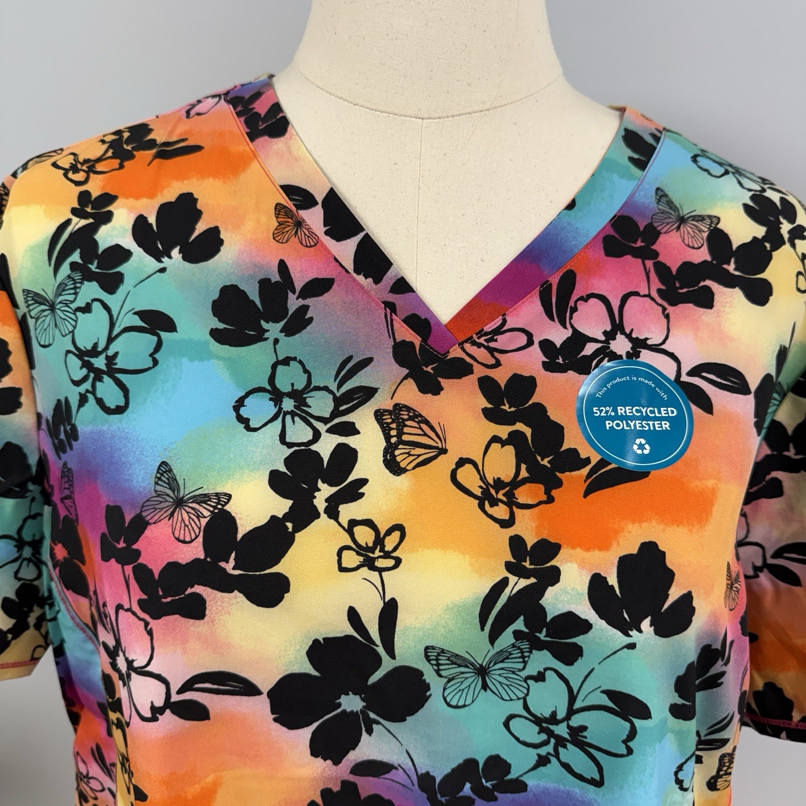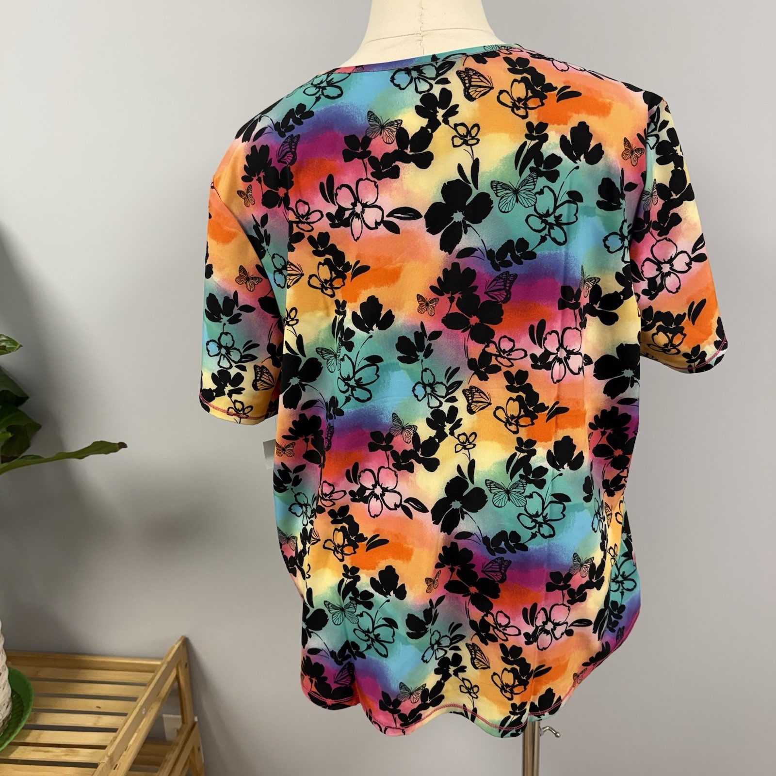 как выглядит NWT Cherokee Scrub Top 3X Black Floral Butterflies Rainbow Background Scrubs фото