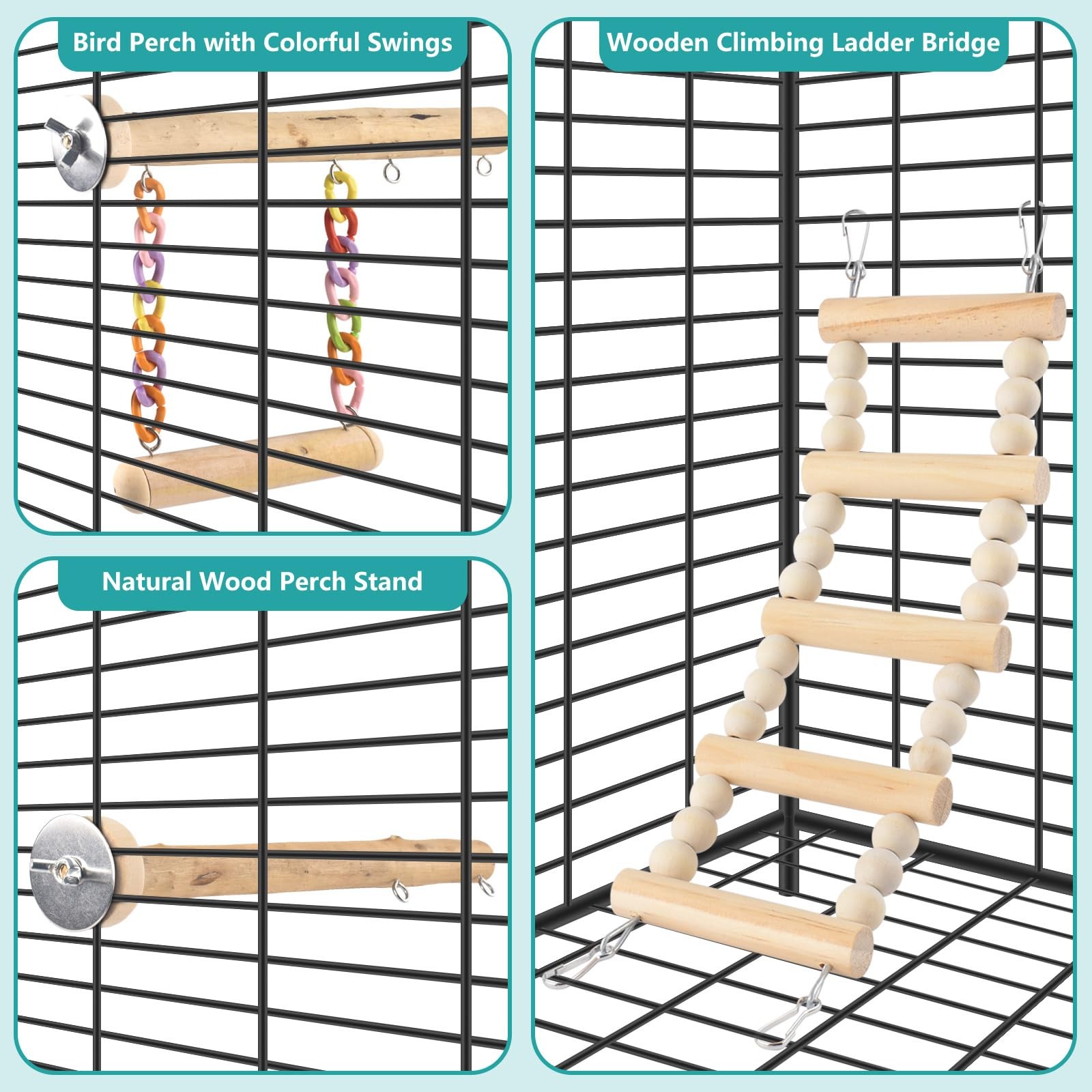 Included Components: 2 Pcs Bird Perches, Bird Ladder, Bird Swing