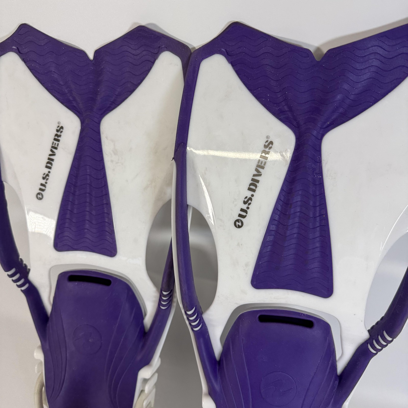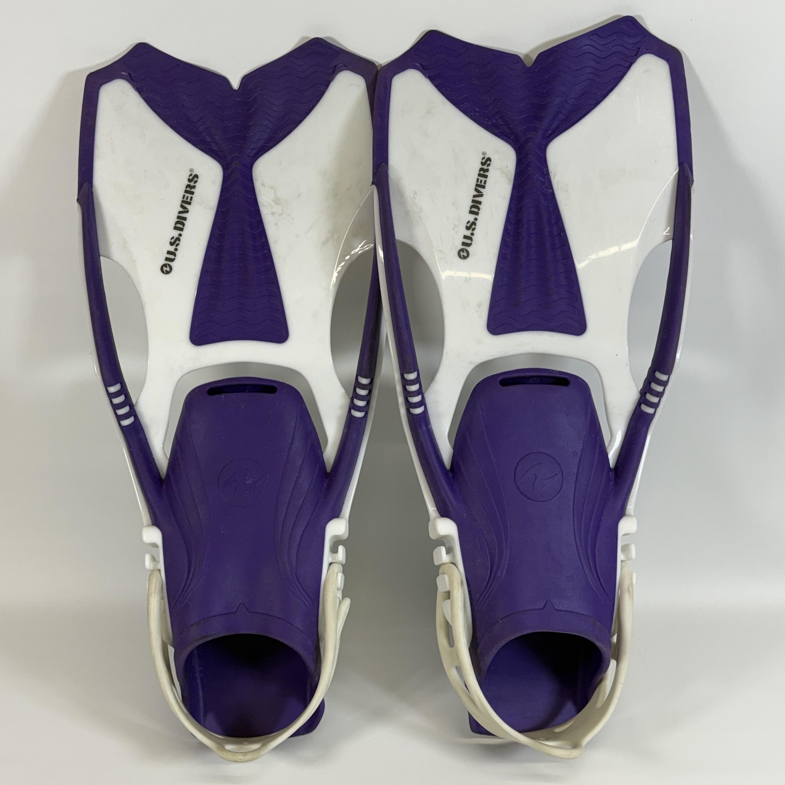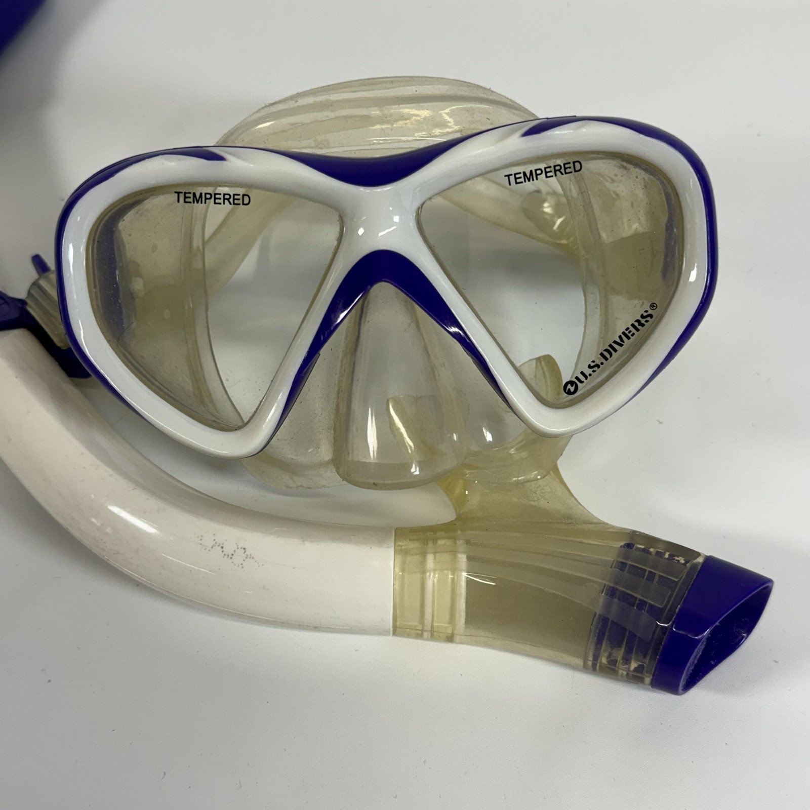 U.S. Divers Snorkel Mask Fins Set Purple White Mesh Bag Tempered Glass Set