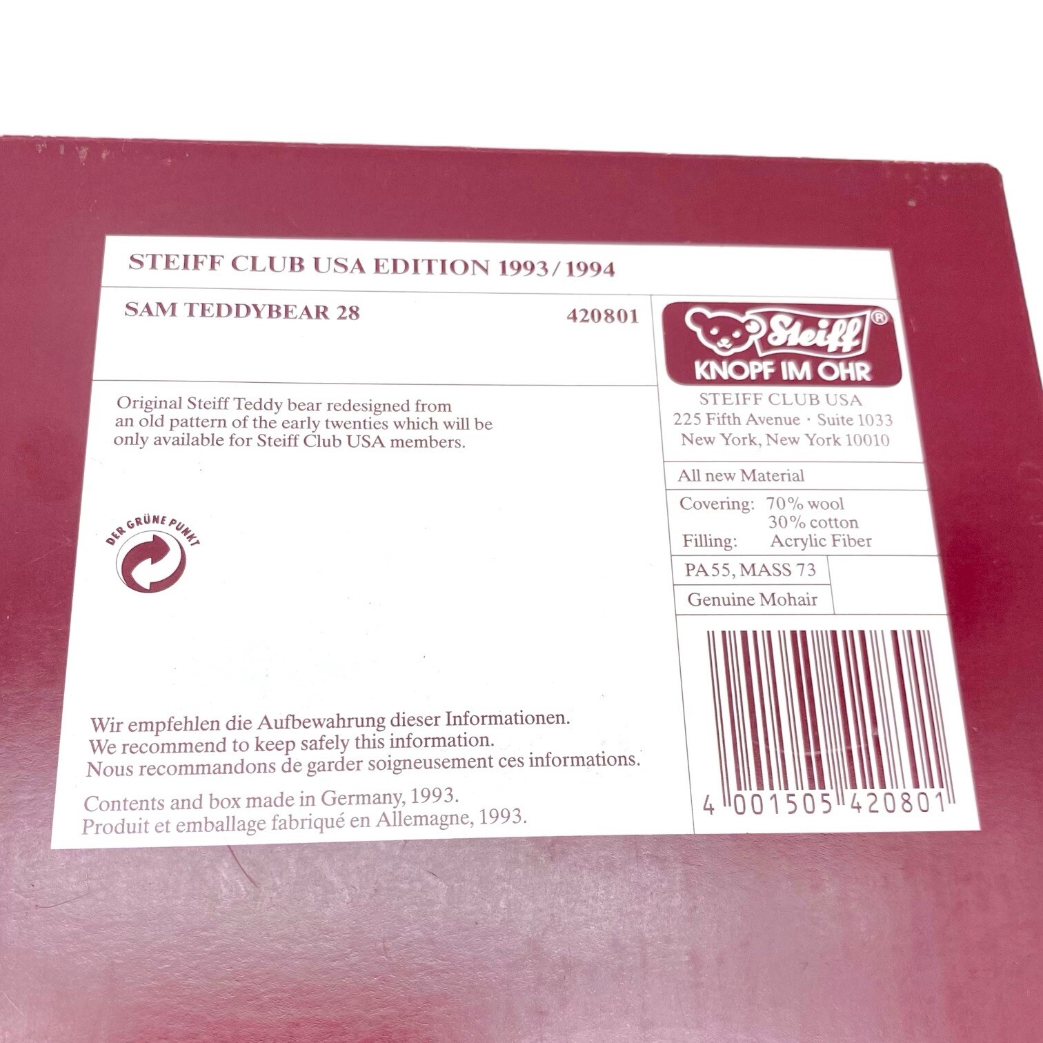 Steiff Club USA Sam Teddy Bear 1993/94 Premiere Mohair Germany Medal