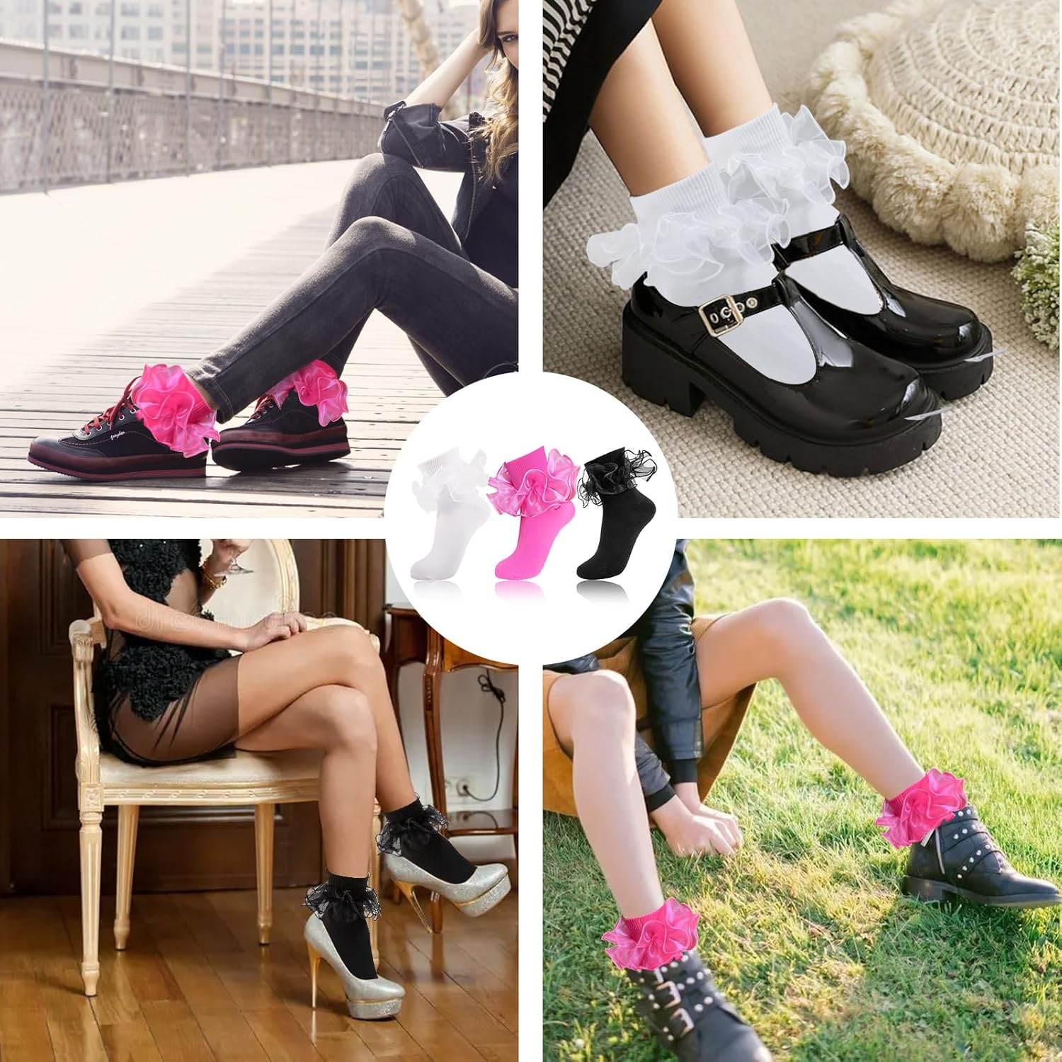 Women Big Ruffle Ankle Socks,Adult Double Lace Turn Cuff Cotton Frilly Dress Soc