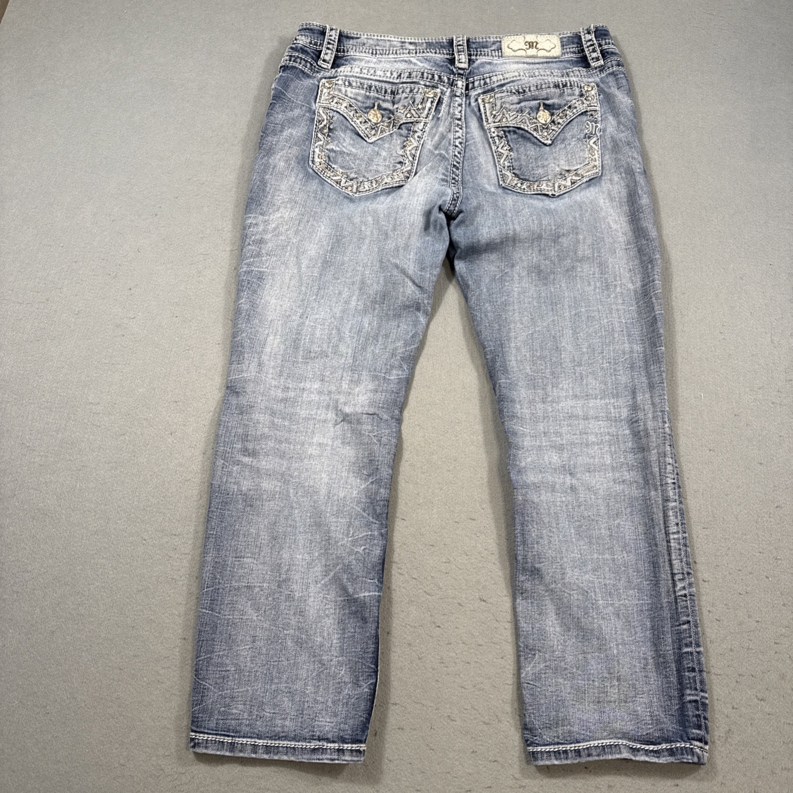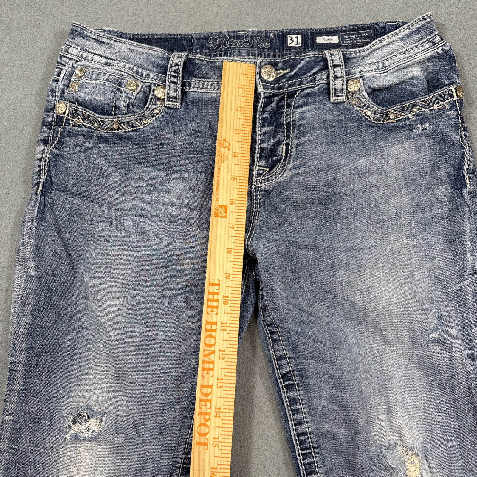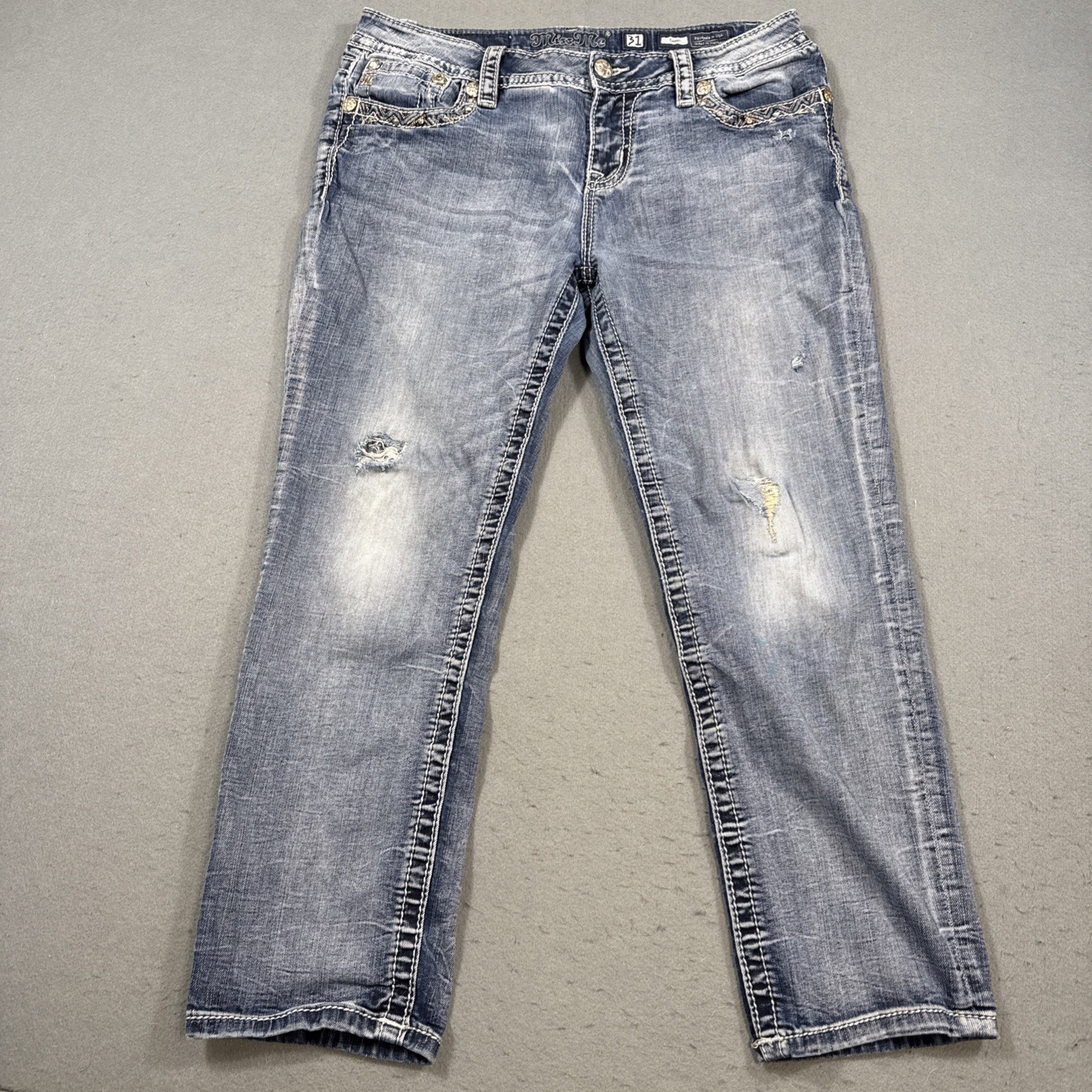 Miss Me capri Jeans LIGHT Stretch THICK STITCH RHINESTONES STUDDED DISTRESSED