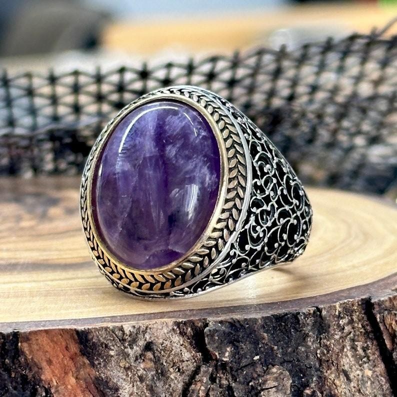 Turkish Handmade Silver Amethyst Silver Men Natural Amethyst Ring