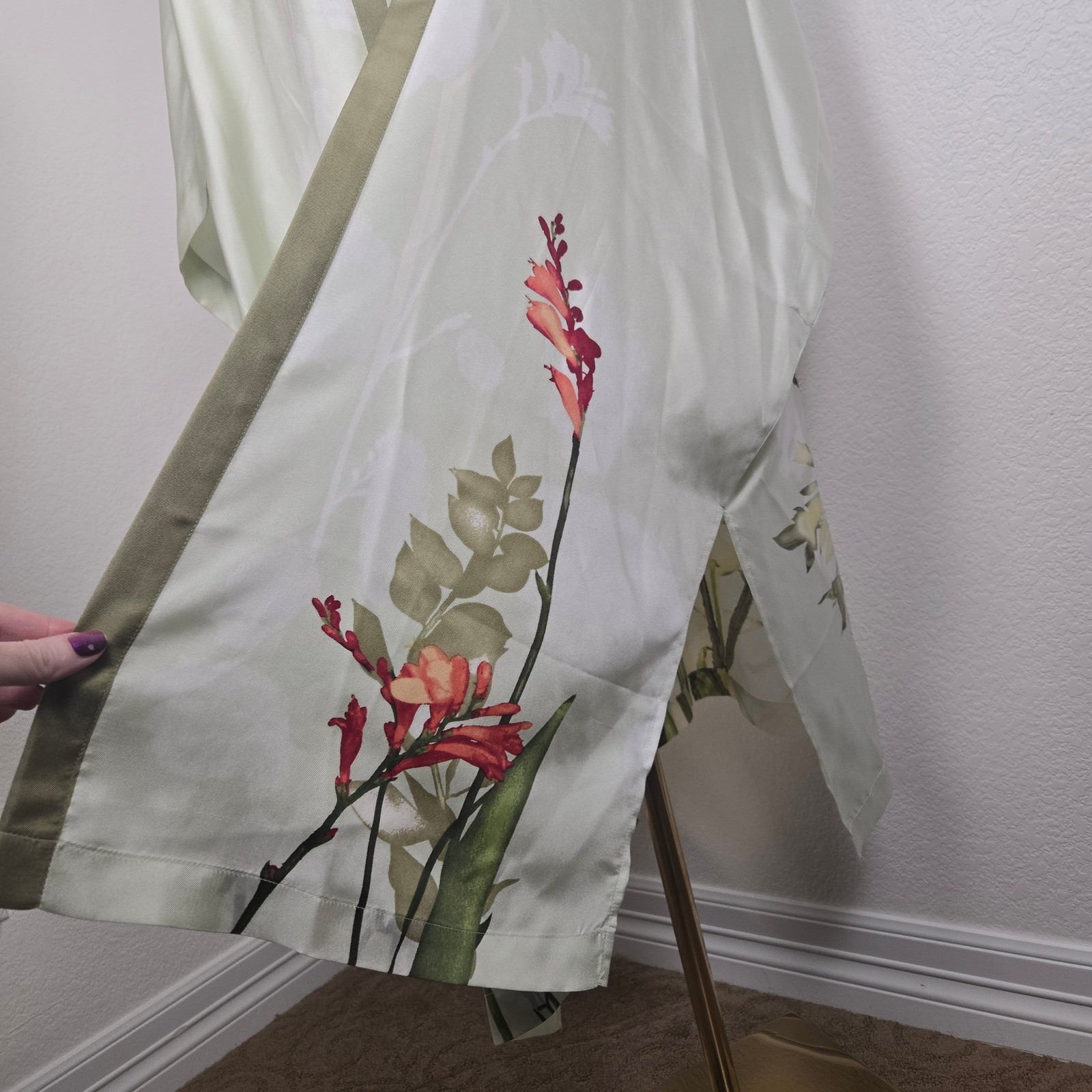 как выглядит 100 Silk Floral Kimono Topper Open Front Botanical Sage Green NWT Chico