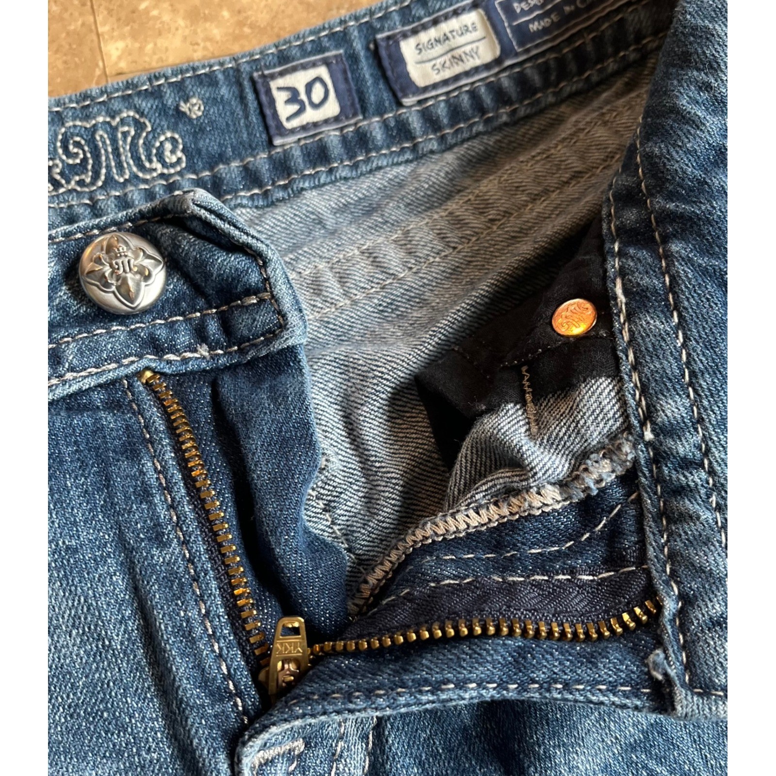 Miss Me Signature Skinny Jeans Womens 30 Medium Wash Raw Hem Embroidered Pockets