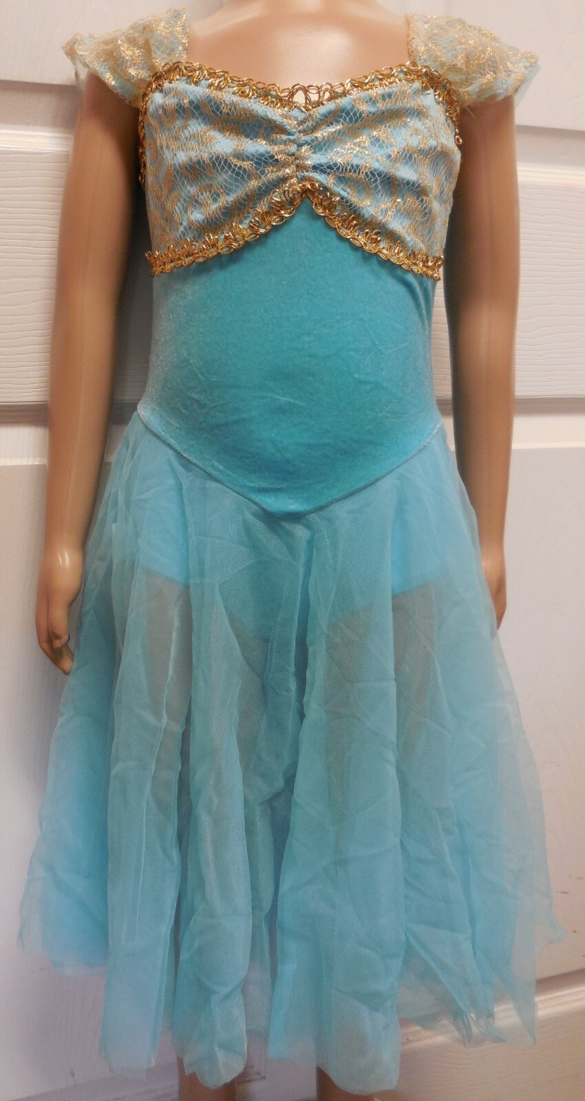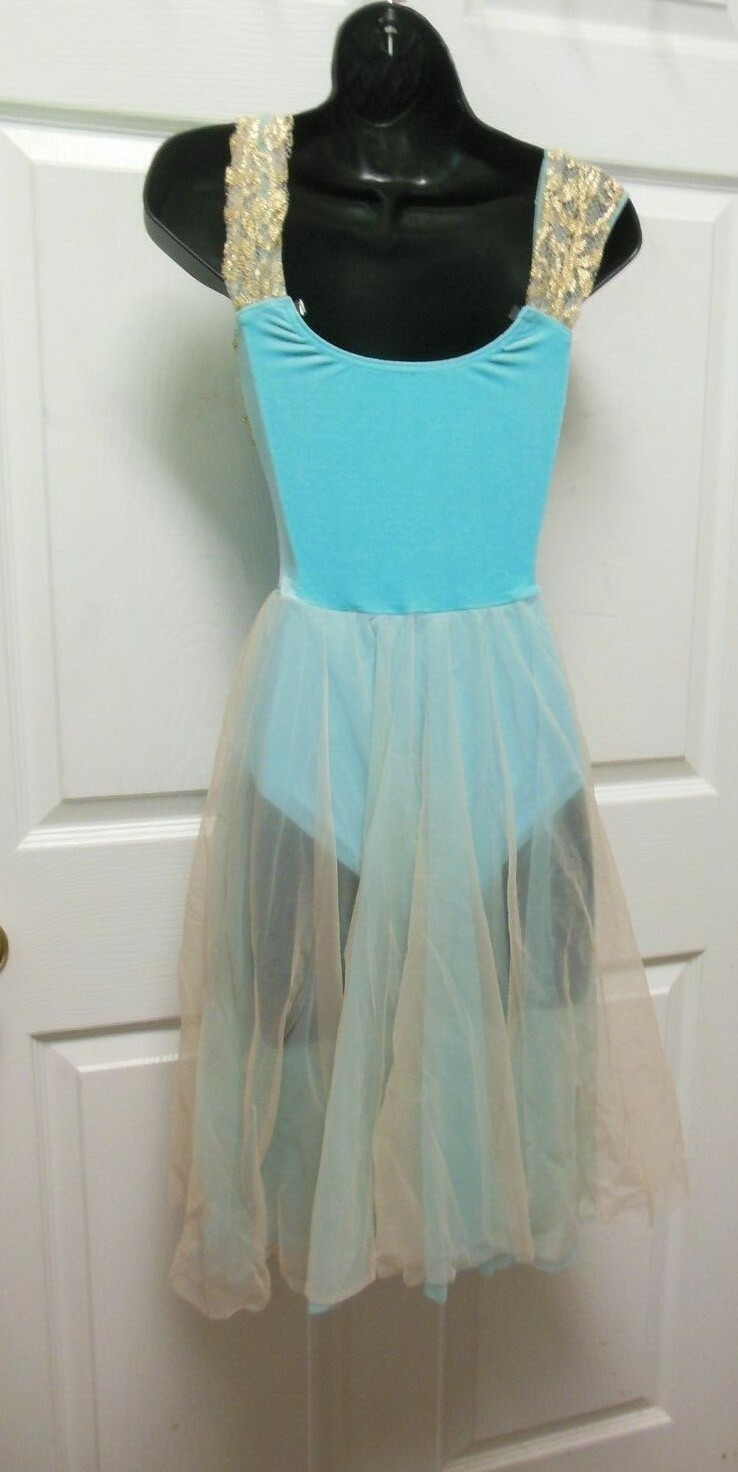 Dress Lyrical Ballet Gold Lace Velvet Bodice Full Chiffon Skirt Copen Blue NWT