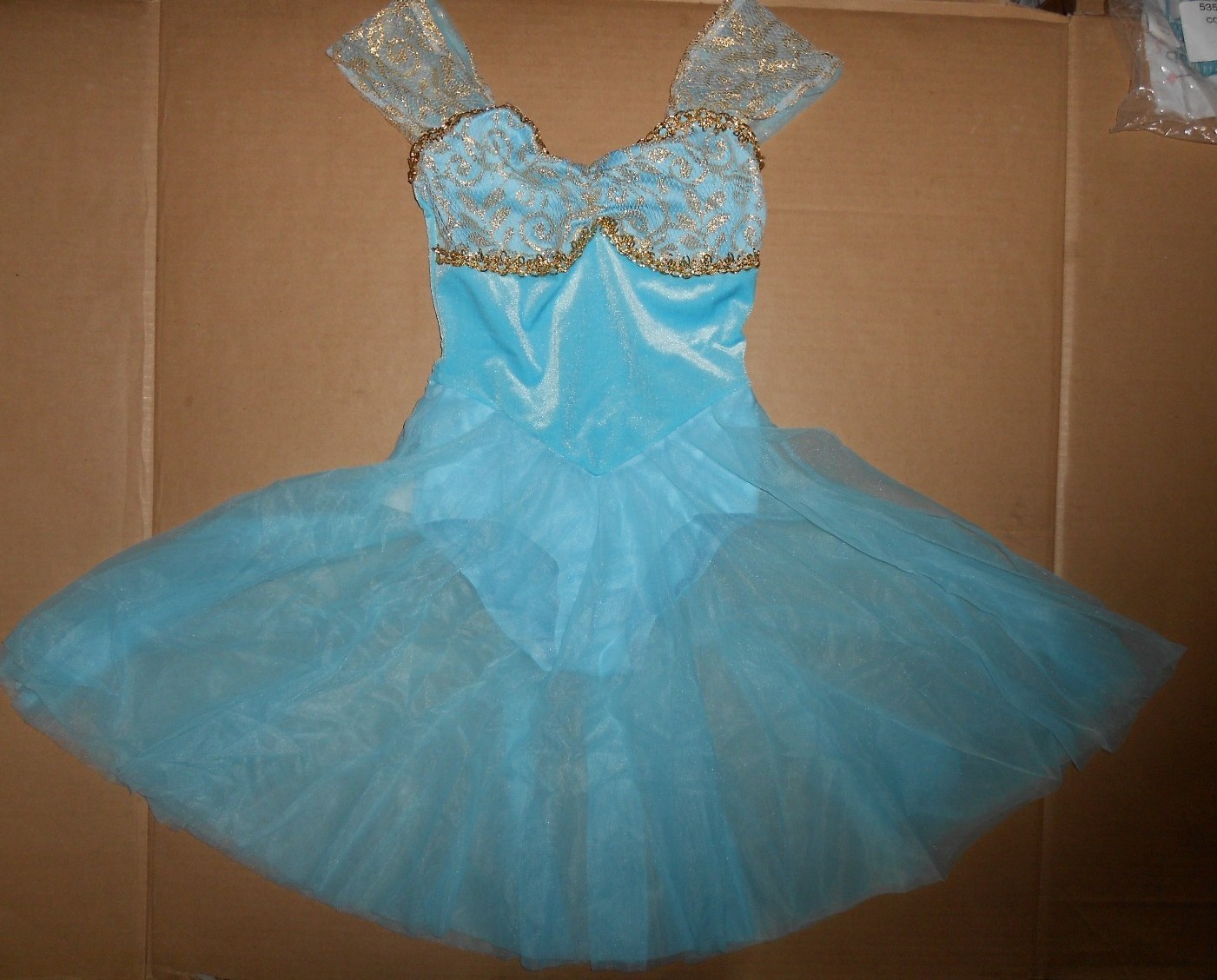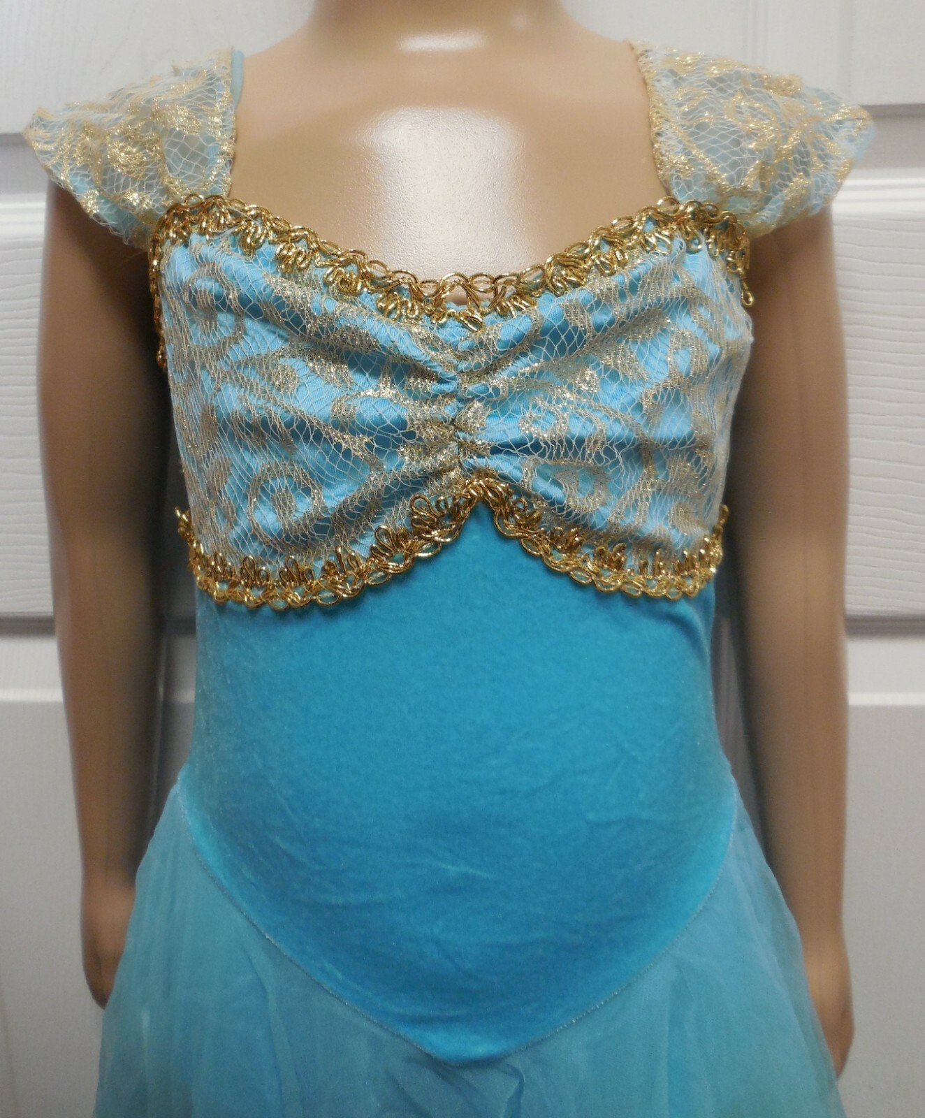 как выглядит Dress Lyrical Ballet Gold Lace Velvet Bodice Full Chiffon Skirt Copen Blue NWT фото