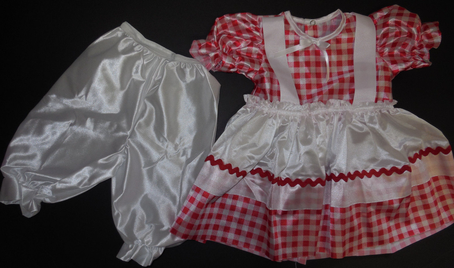 Raggedy Doll Girl Costume Red White Gingham Satinette Dress Bloomers FREE WIG