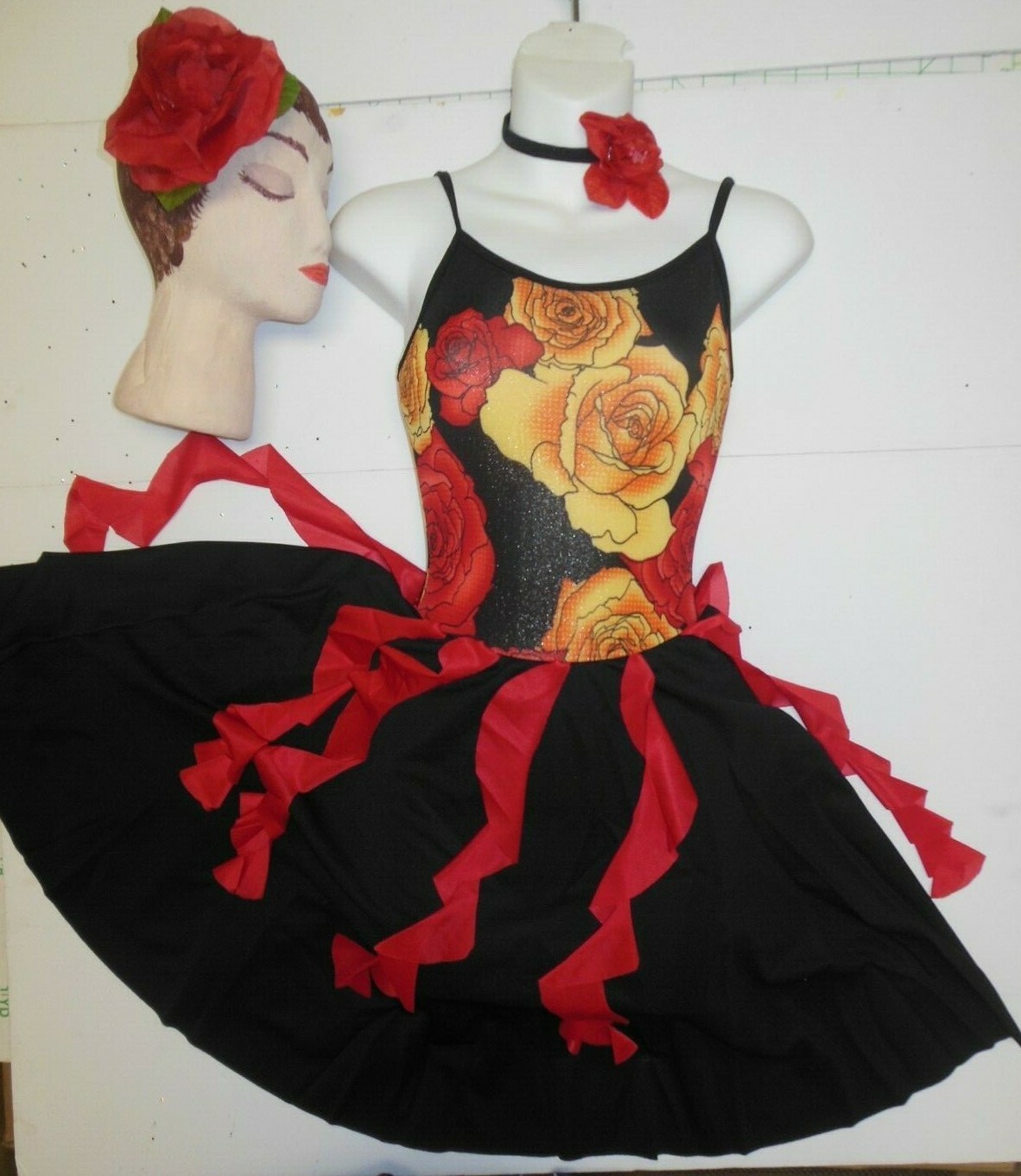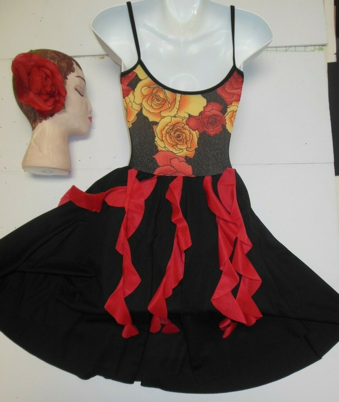 Latin Flair Dance Costume dress red tendrils complete leotard under skirt Med Ch