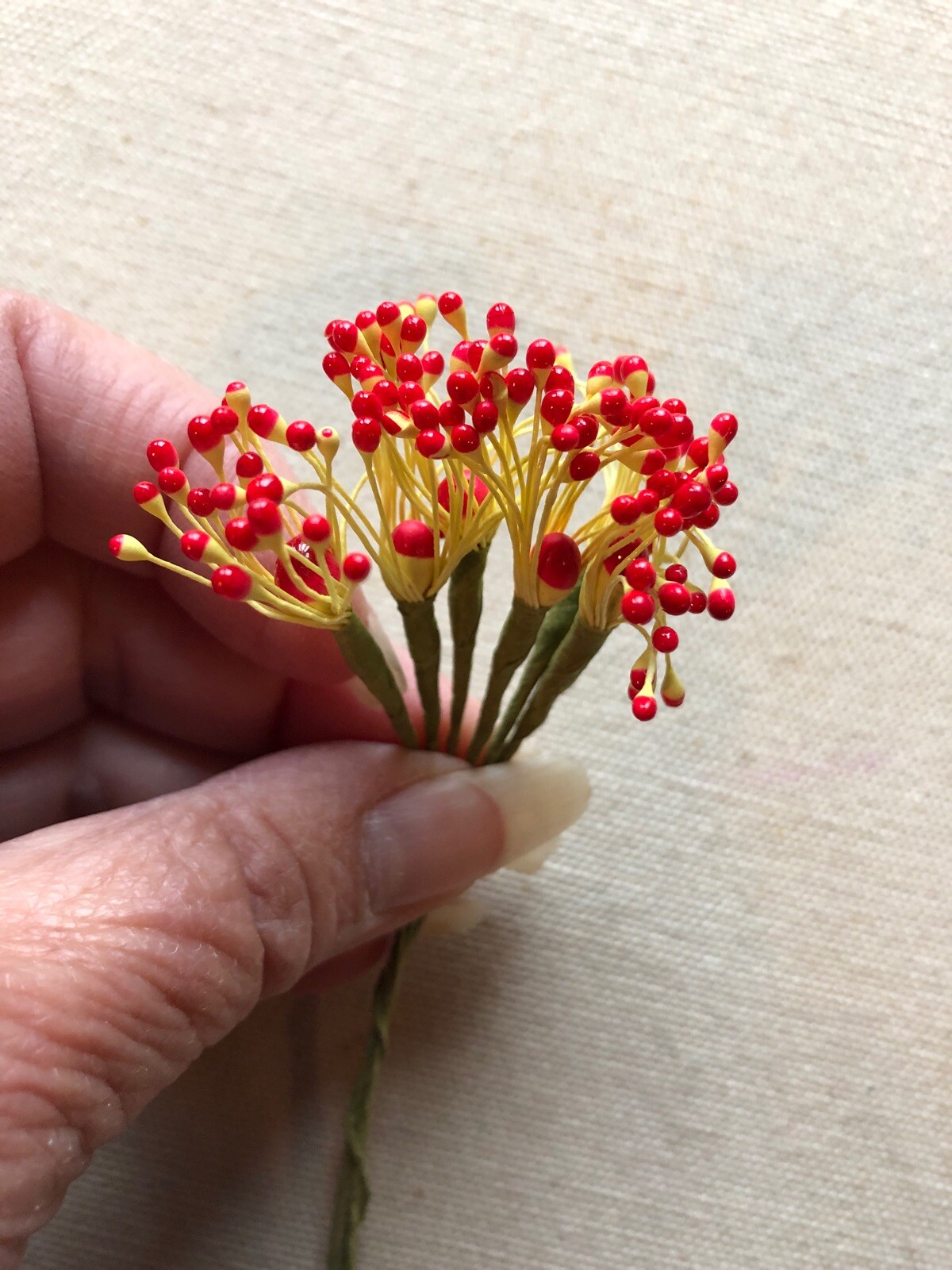 Vintage Millinery Flower Red Yellow Stamen 4 bunch Lot Unused Stock HzM