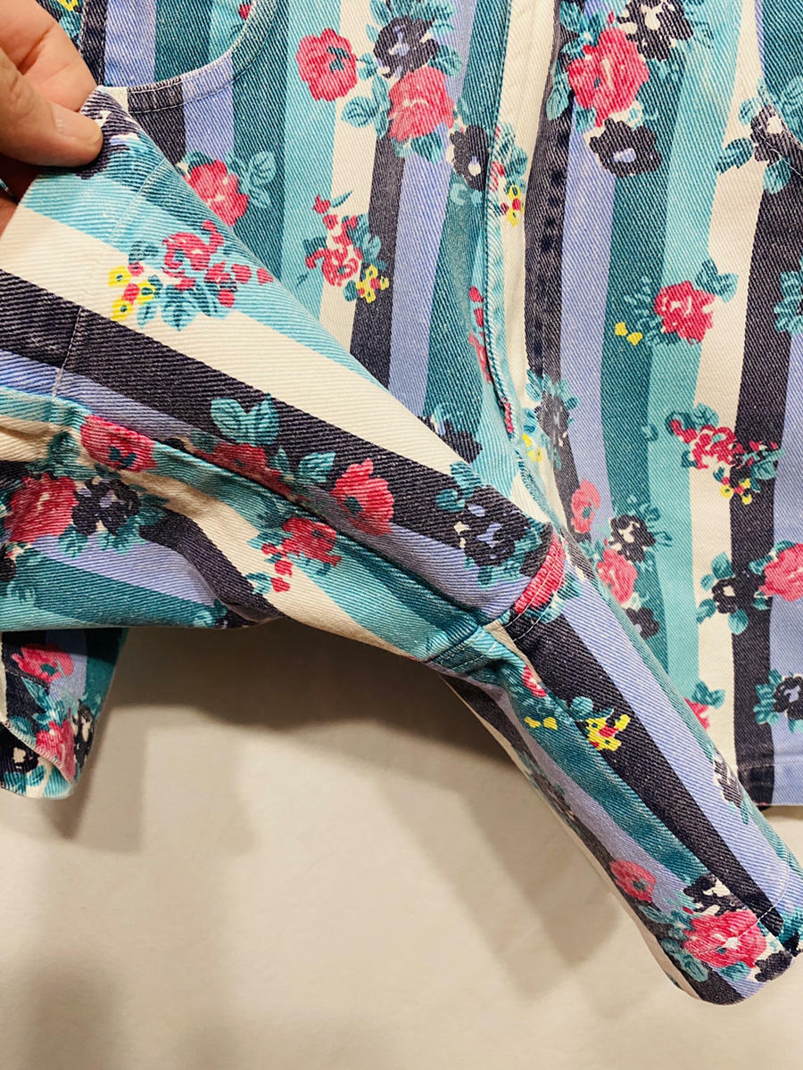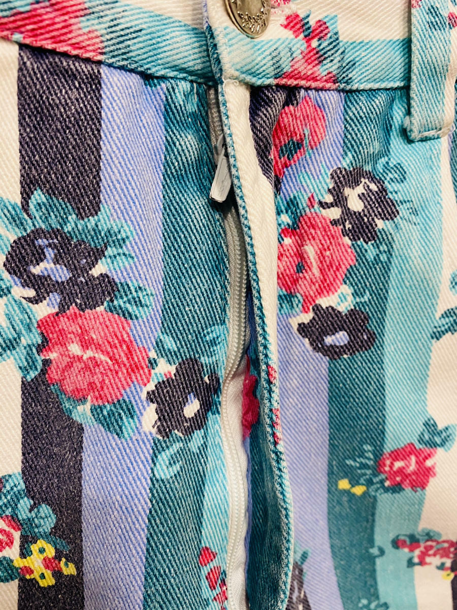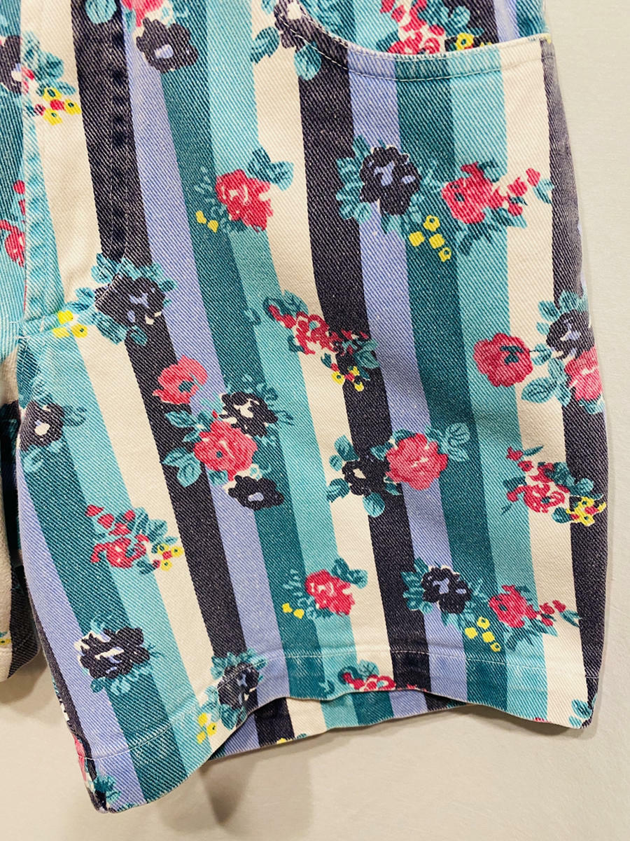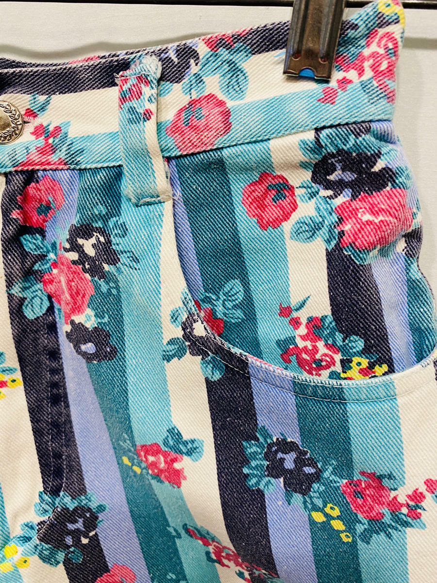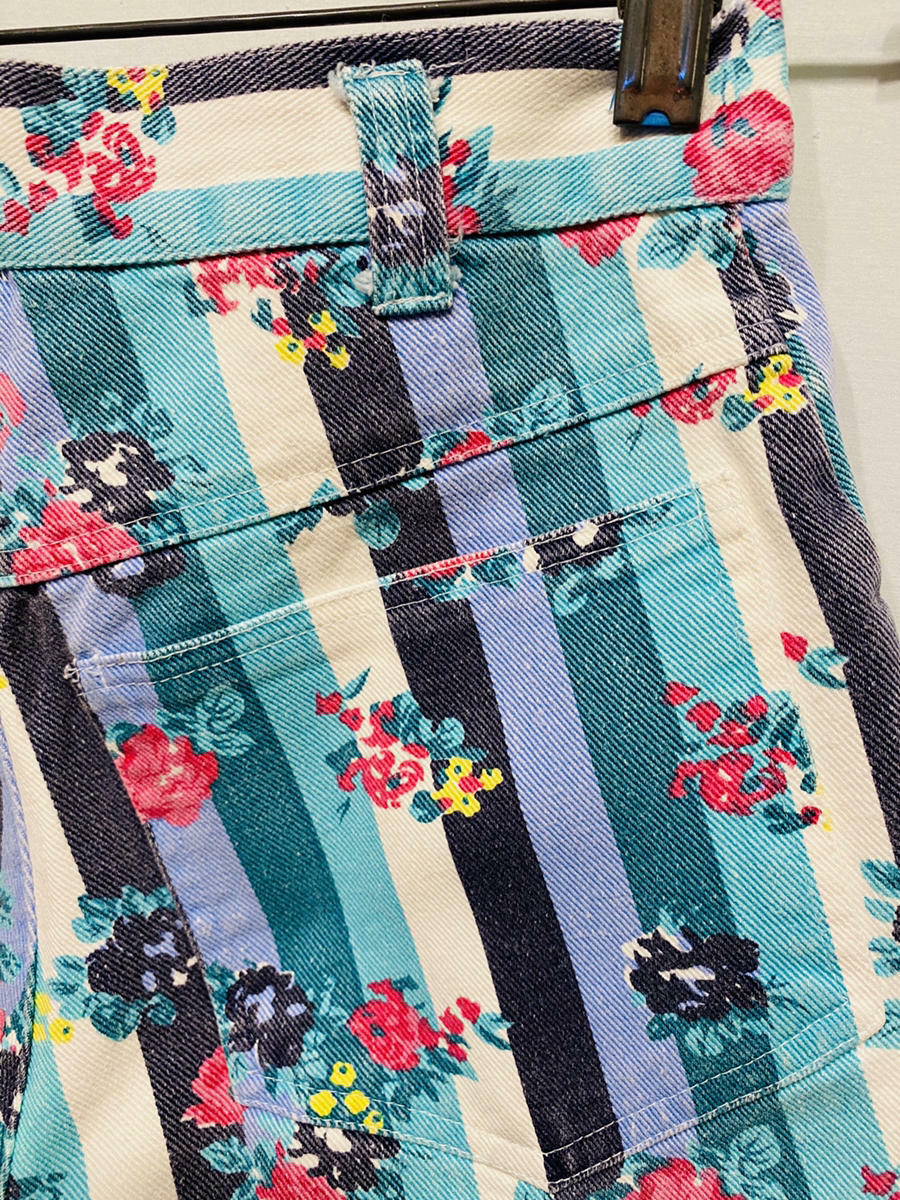 Vtg 80s BRANDON Denim High Waisted Jean Shorts Navy Green Stripes FLOWERS XS S