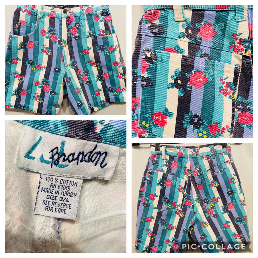 как выглядит Vtg 80s BRANDON Denim High Waisted Jean Shorts Navy Green Stripes FLOWERS XS S фото