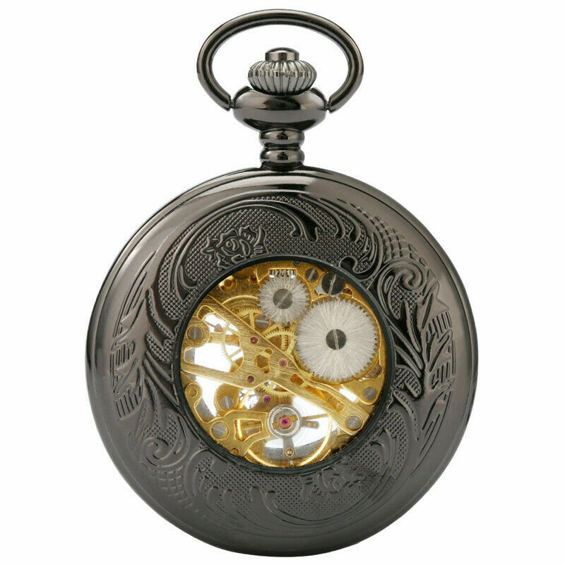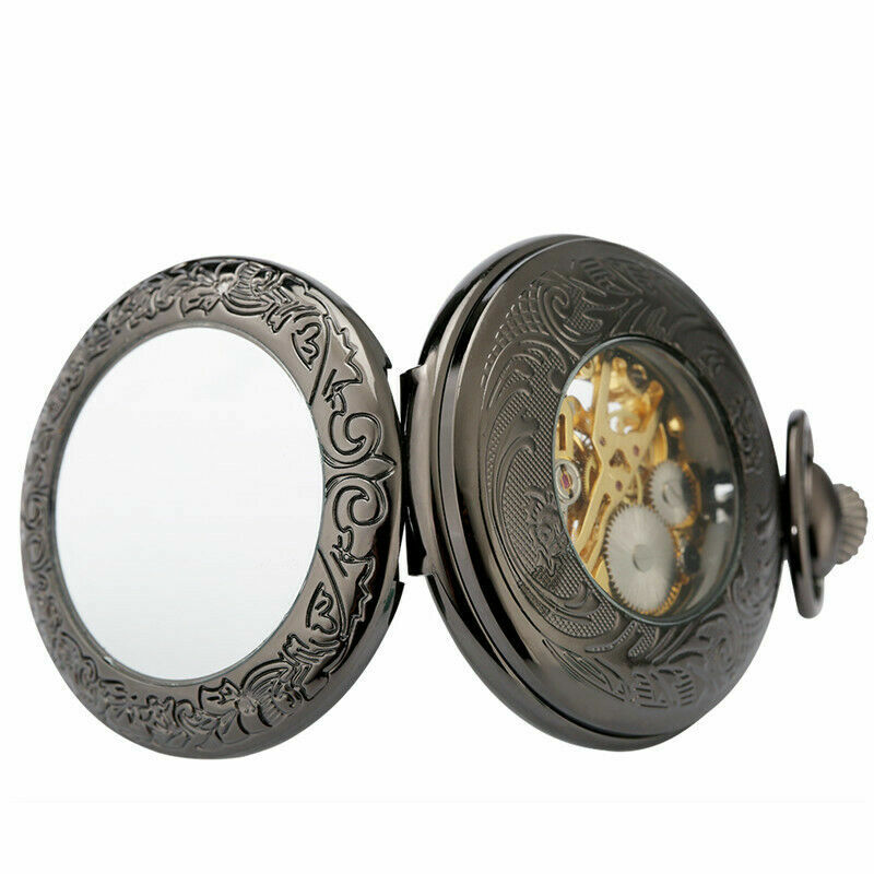 Steampunk Black Men's Handwind Mechanical Pocket Watch FOB Pendant Chain Gift