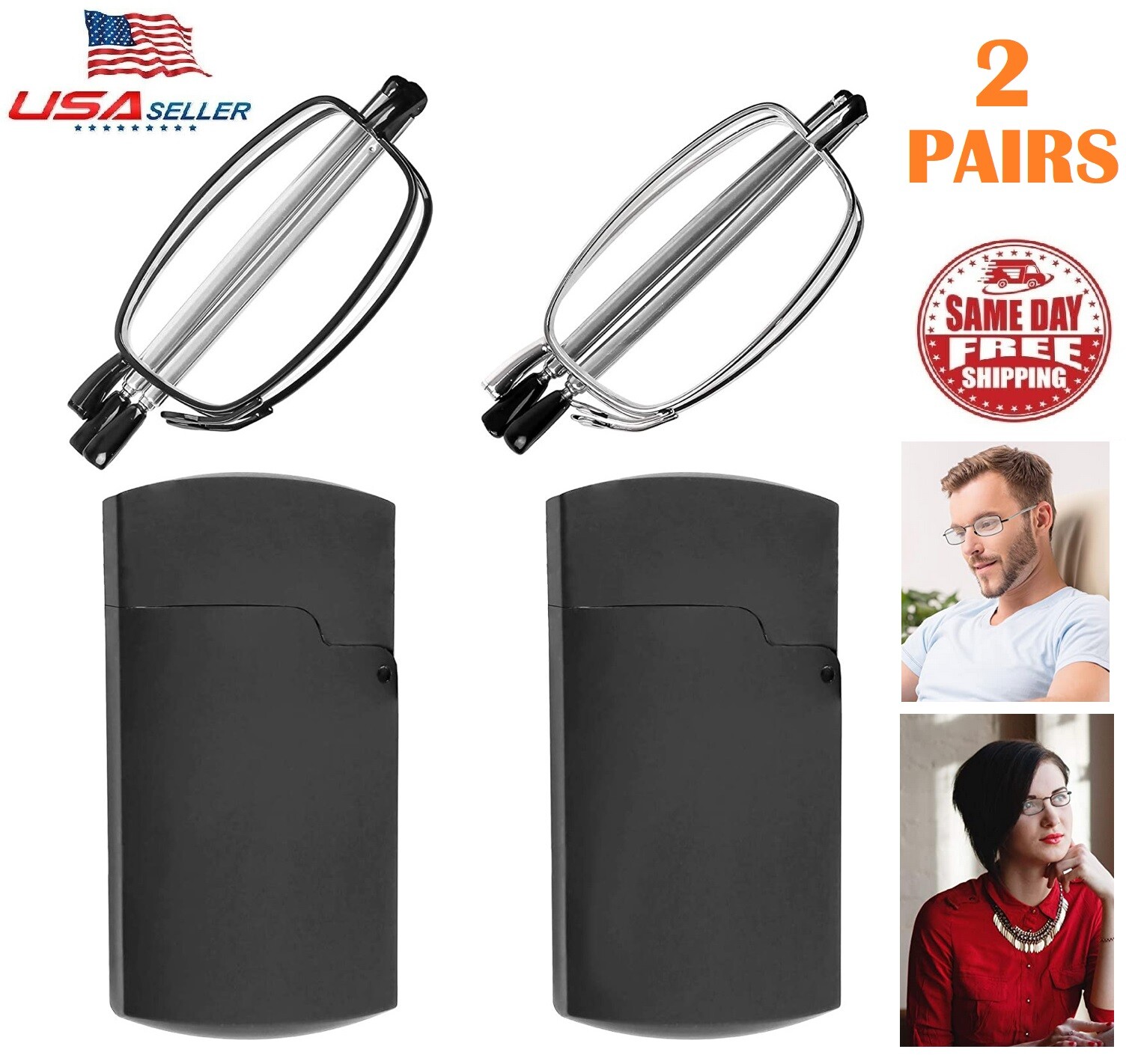 2 Pair Metal Compact Folding Anti-Blue Light Reading Glasses W/ Carrying Case US
